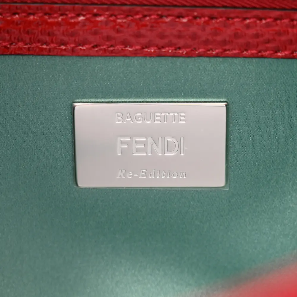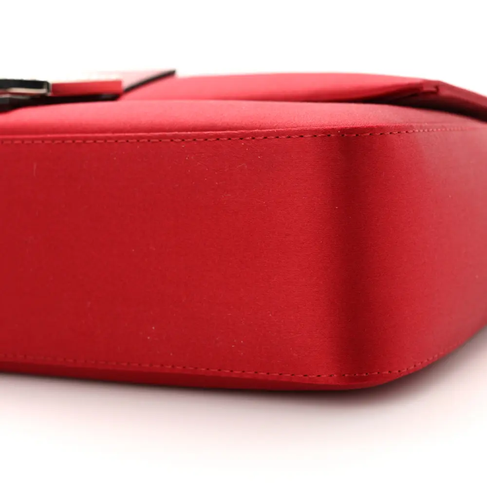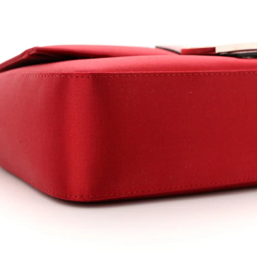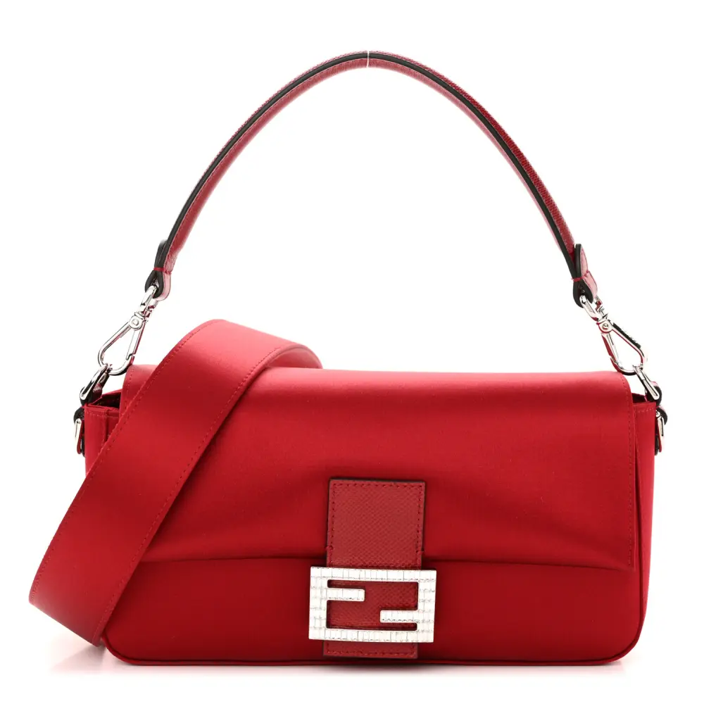This Fendi Baguette in Rosso Scuro features Satin Karung Leather with Crystal embellishments. Silver hardware adds a polished finish to its elegant design. Compact yet functional for your essentials. Its luxurious texture exudes sophistication and style. Ideal for glamorous events or evening occasions. A timeless addition to your collection.