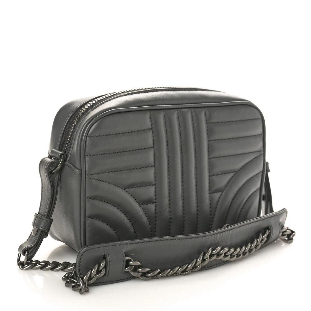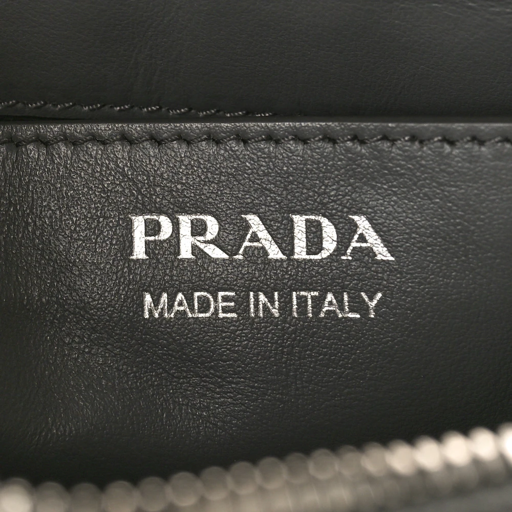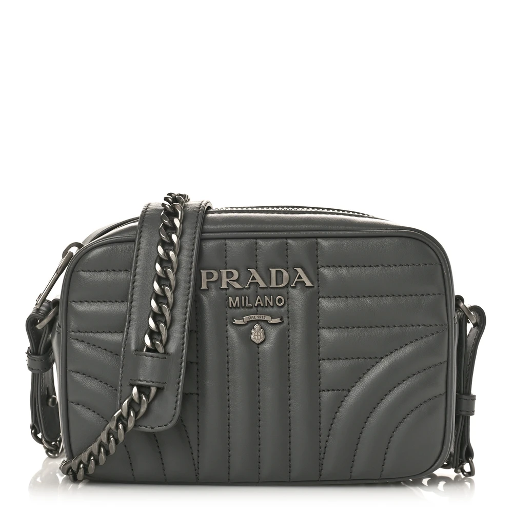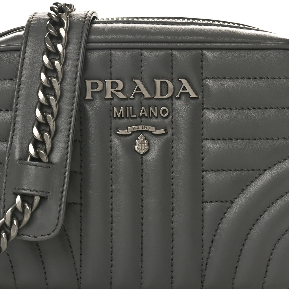 This Prada Medium Diagramme Crossbody Bag in Mercurio features soft calfskin leather. Silver hardware adds a sleek finish. Spacious compartments ensure organized storage. Adjustable strap offers versatile wear. Perfect for work, travel, or casual outings. A stylish and practical accessory.