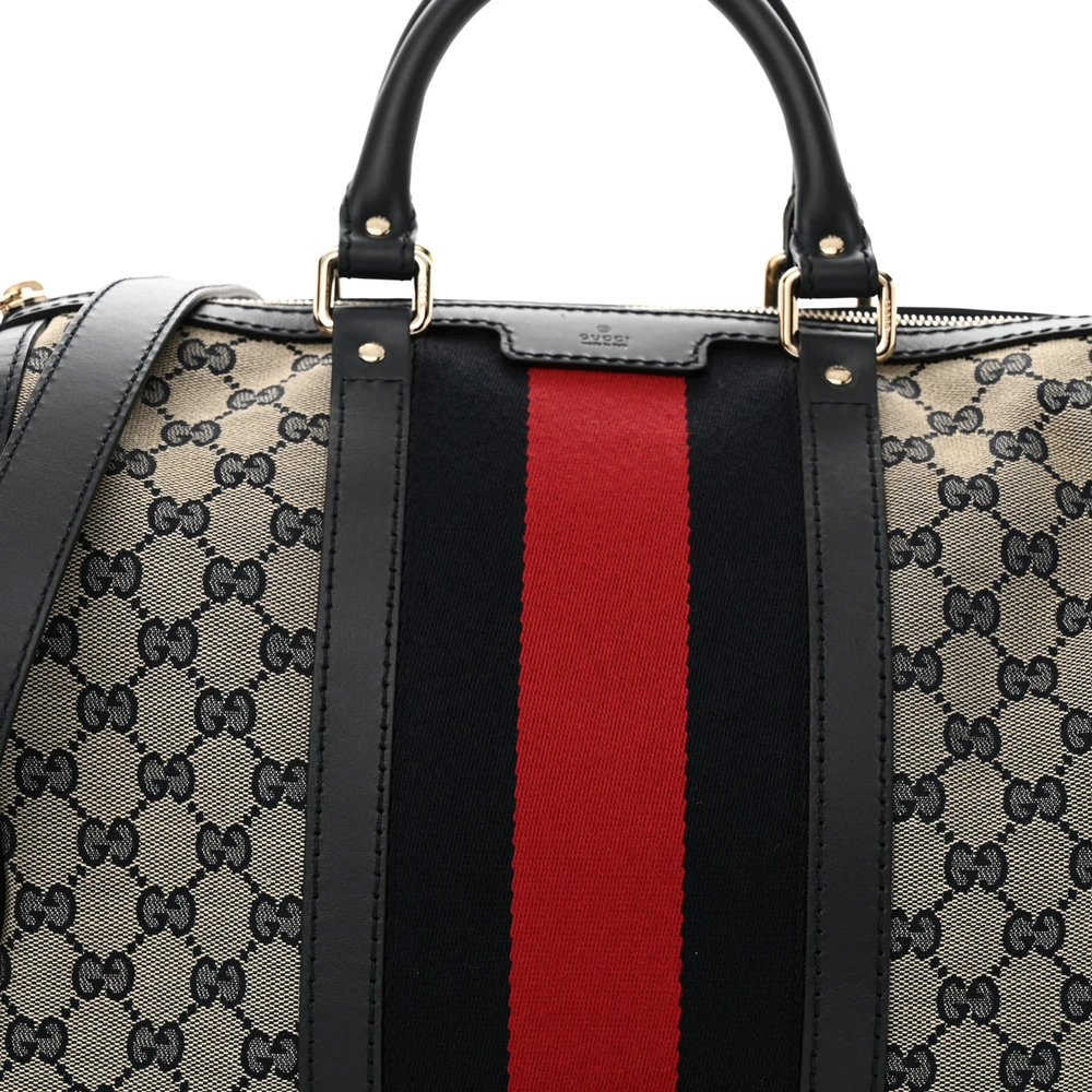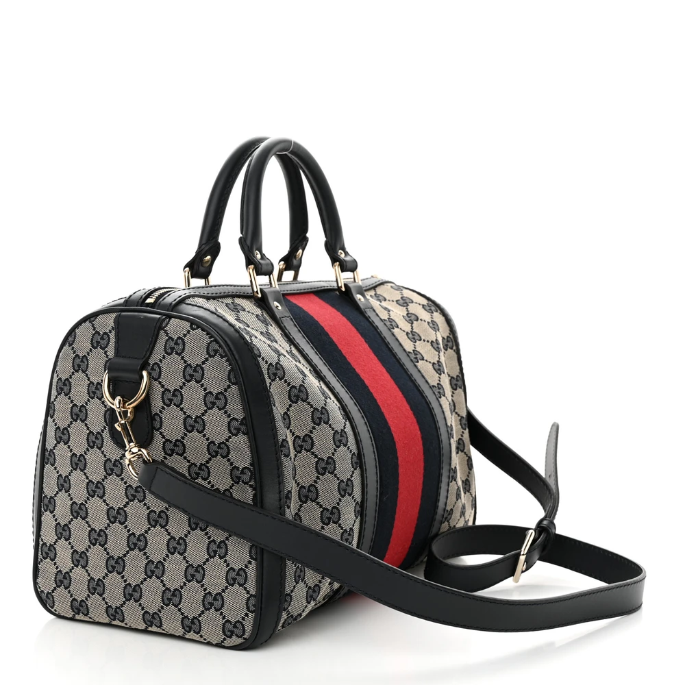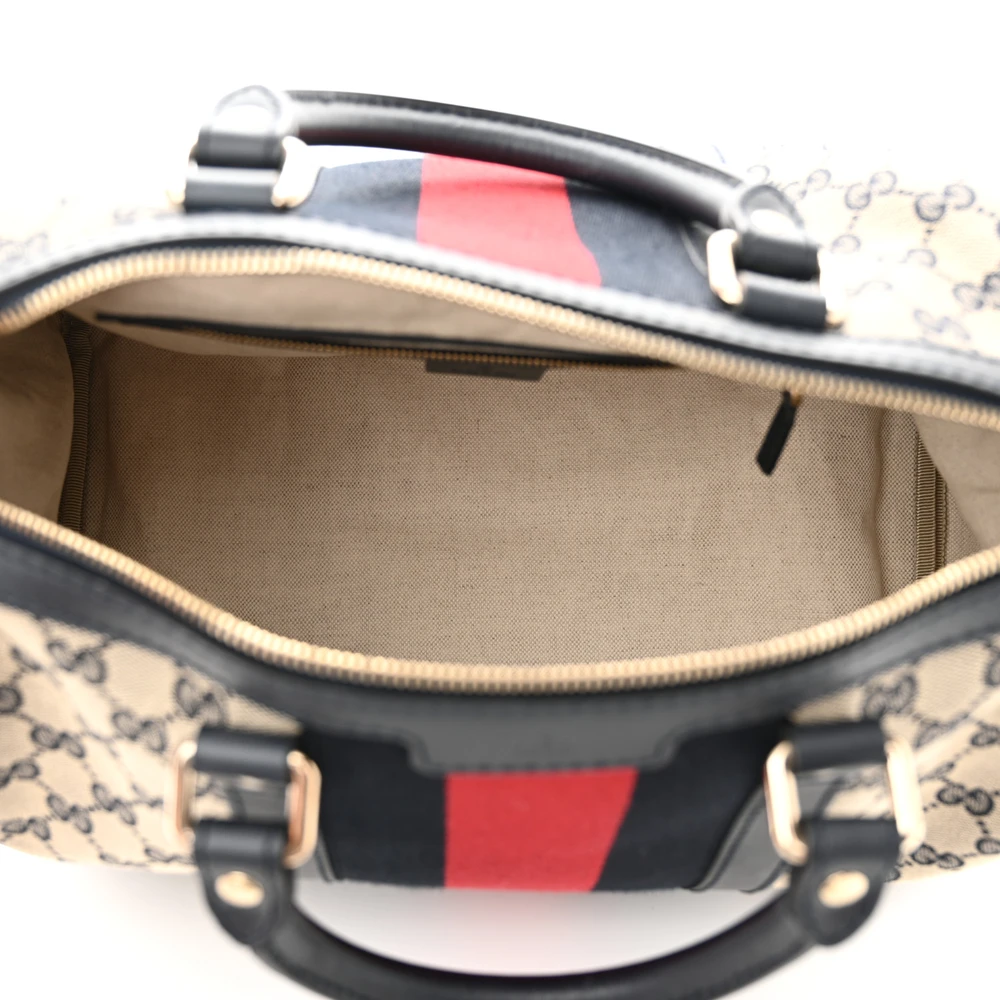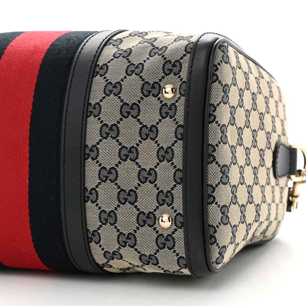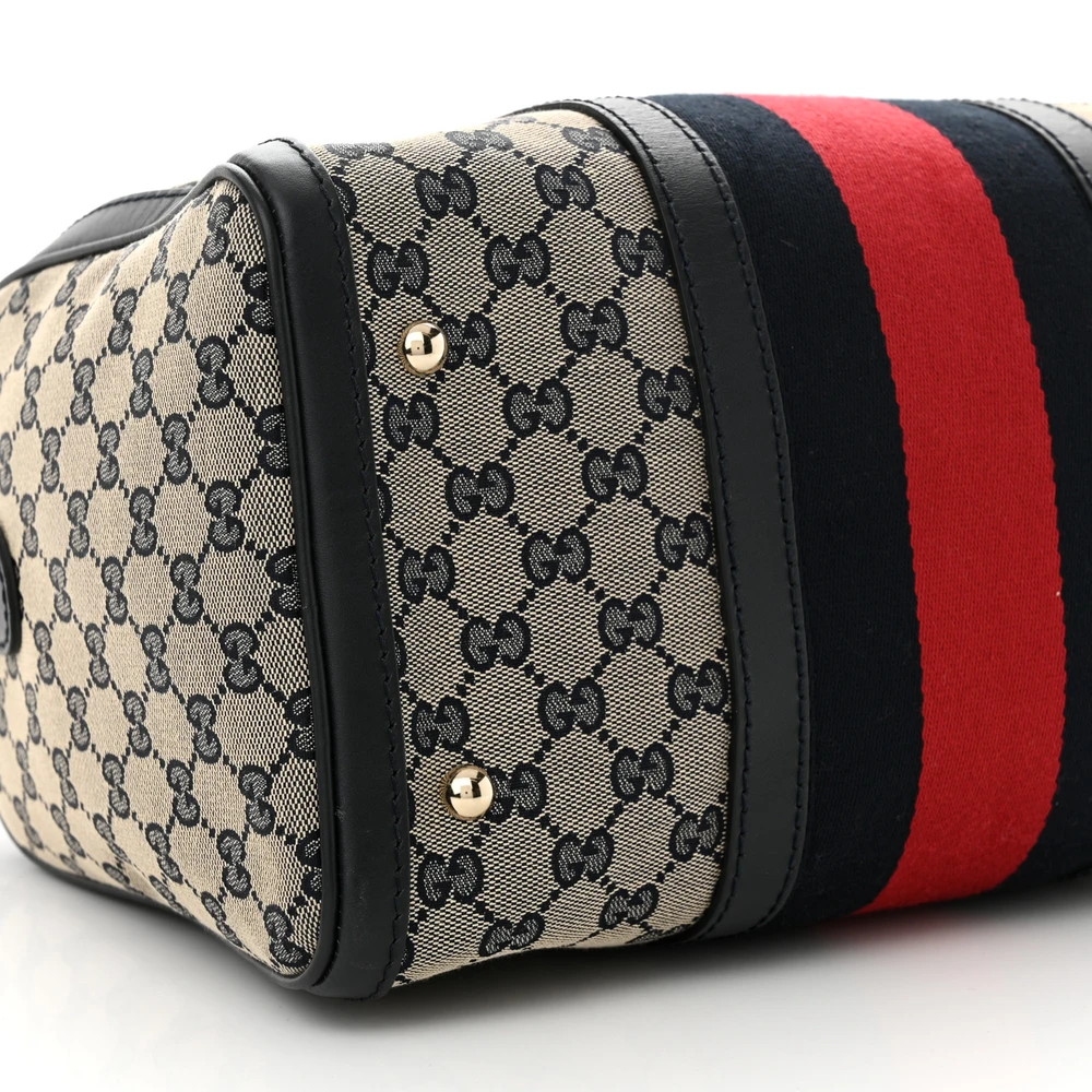 This Gucci Medium Selleria Vintage Web Boston Bag is crafted in beige/blue monogram canvas. Calfskin leather trim adds durability and elegance. Gold hardware highlights its sophisticated design. Spacious and practical for daily use.