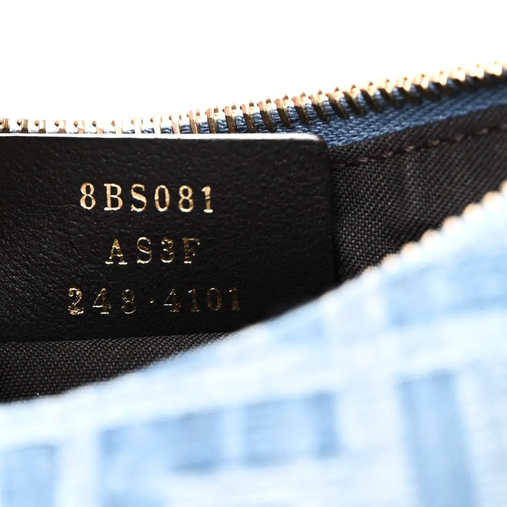 This Fendi Mini FF Embroidered Fendigraphy Hobo Bag in Denim/Sand blends casual and luxury. Gold hardware enhances its embroidered details. Its compact size is perfect for minimalists. The versatile strap ensures comfortable wear. Denim material adds a playful yet refined touch. A modern choice for stylish on-the-go outfits.