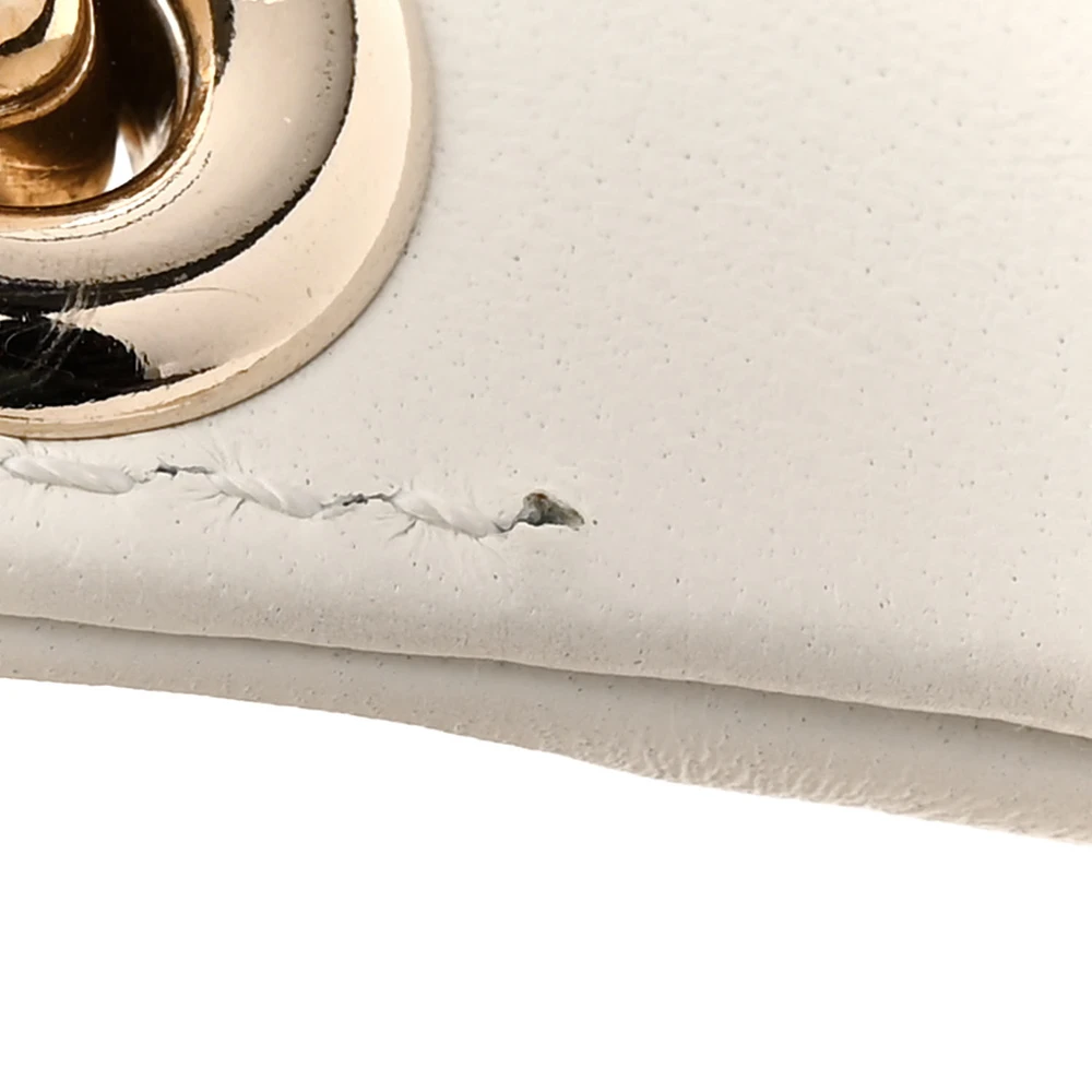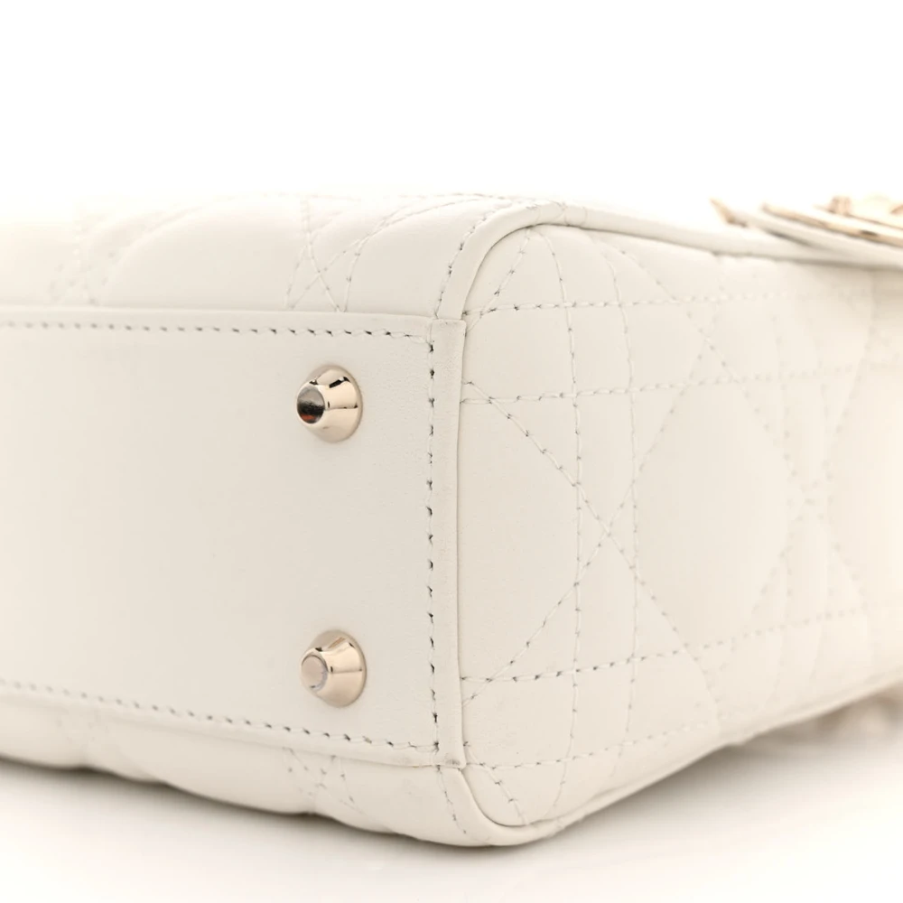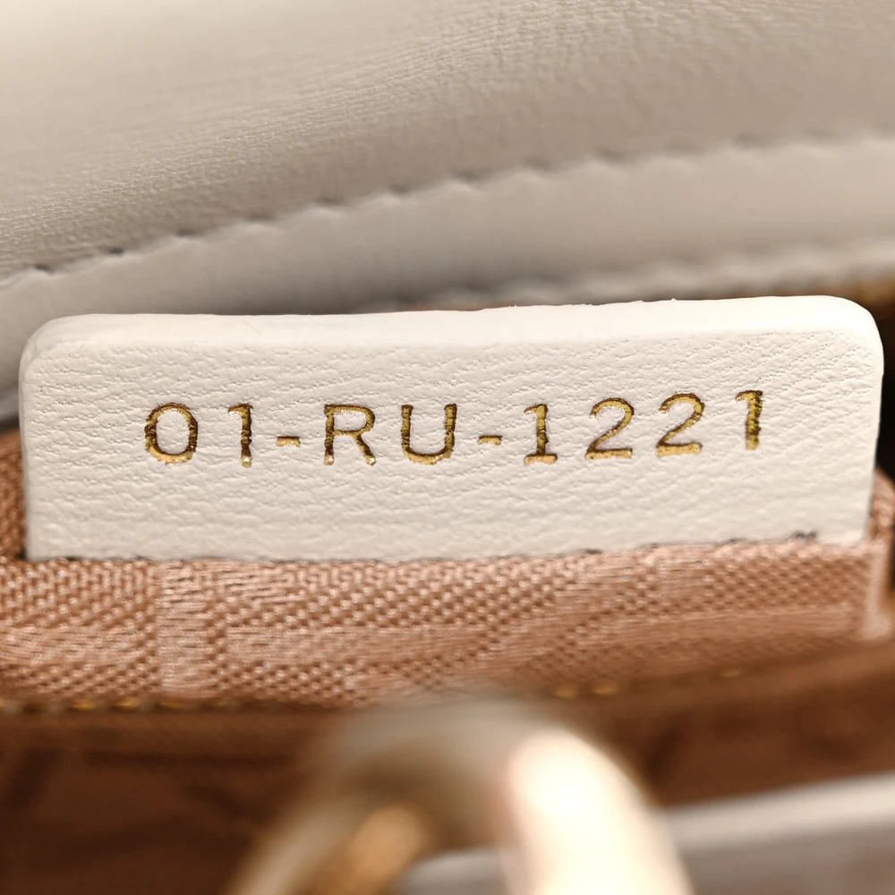 This Dior Mini Lady Dior in White Cannage Lambskin Leather exudes timeless elegance. Gold hardware adds a touch of sophistication, making it a versatile accessory for any occasion. Compact yet functional, it’s perfect for carrying essentials in style.