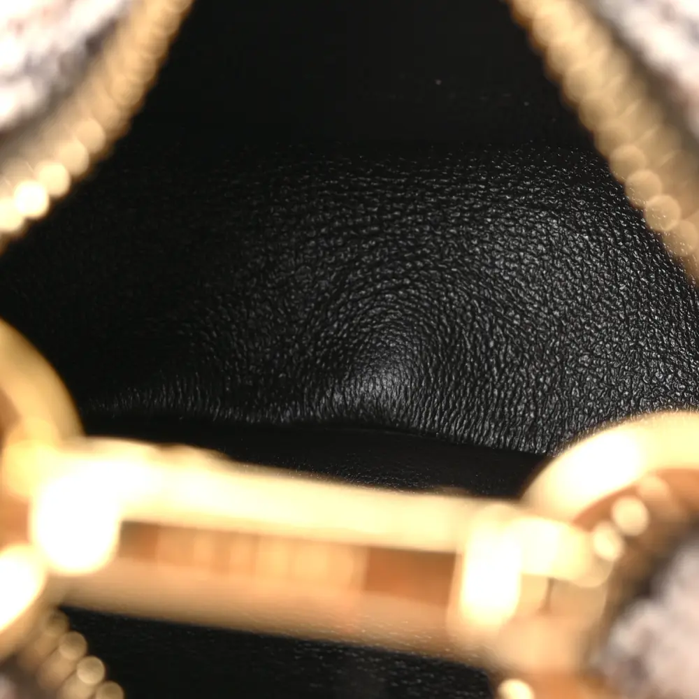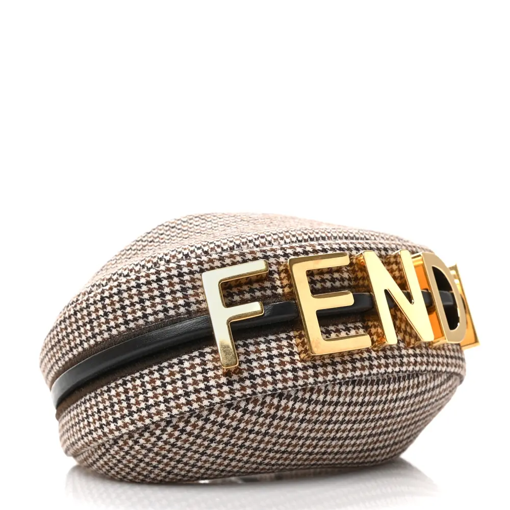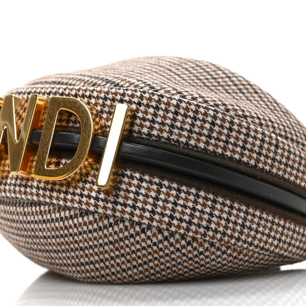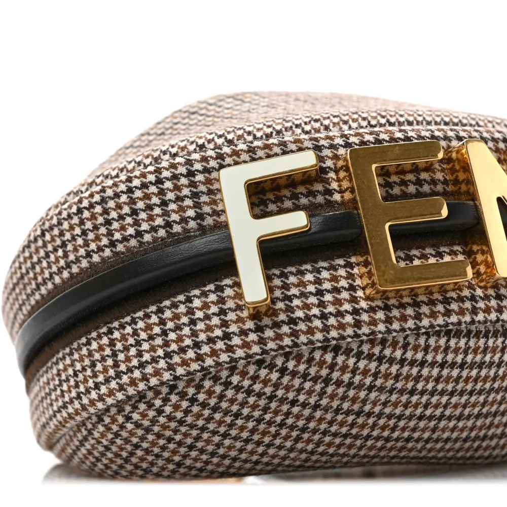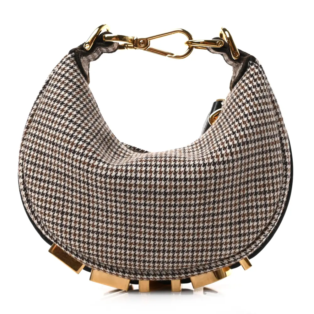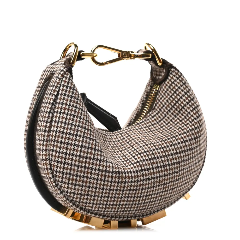This Fendi Nano Fendigraphy Hobo Charm in Beige/Moro features a chic Micro Houndstooth Wool design. Gold hardware complements its compact yet stylish look. Perfect as a bag charm or for carrying small essentials. The nappa leather adds texture and durability. Versatile and trendy, it’s an accessory must-have. A delightful addition to your handbag collection.