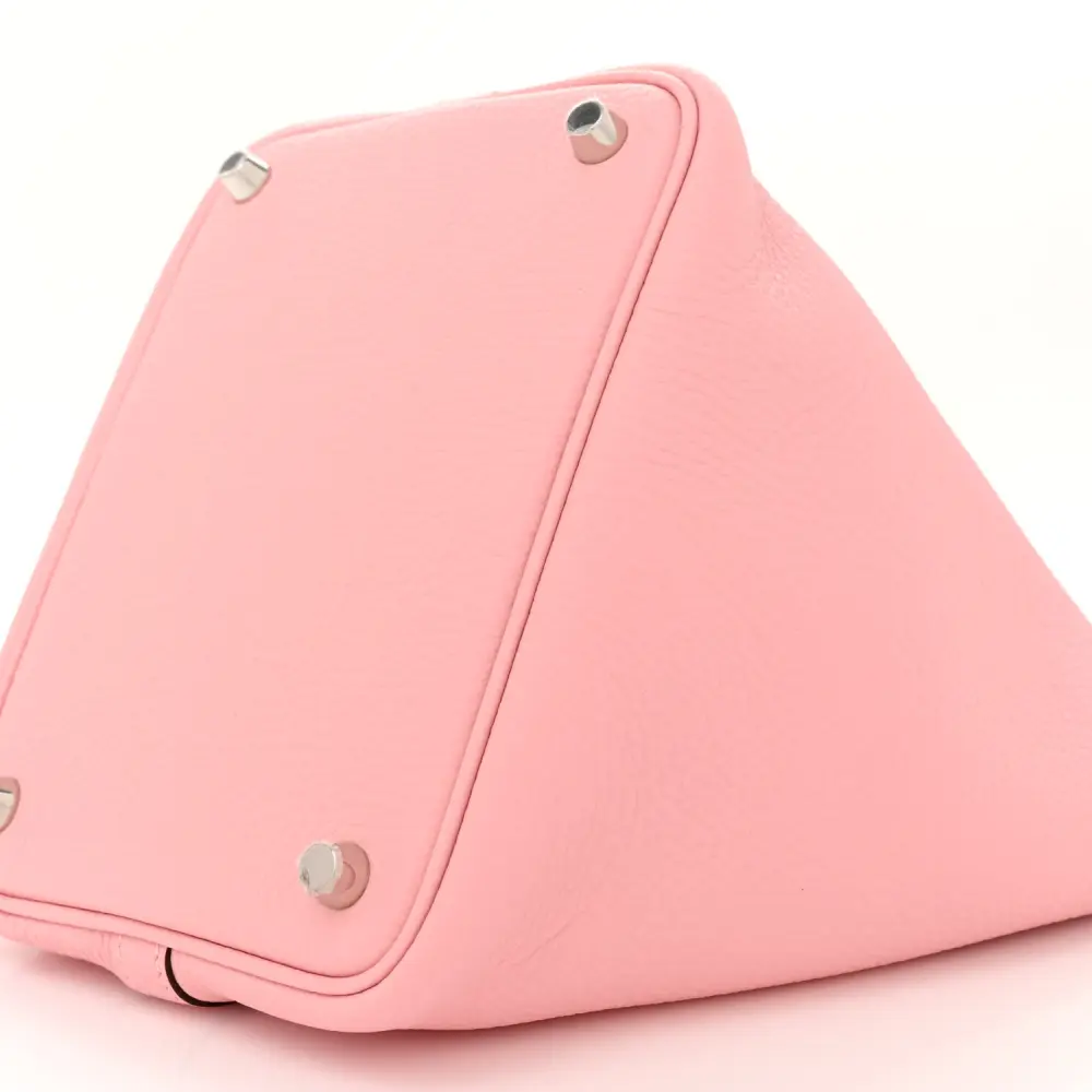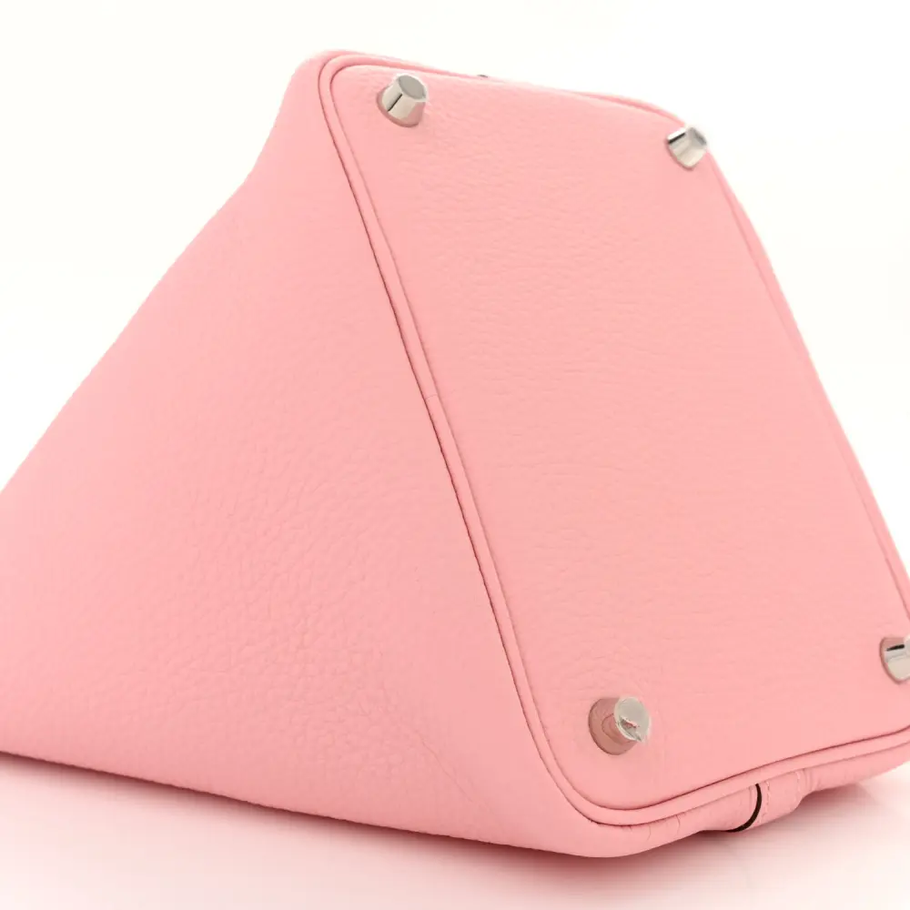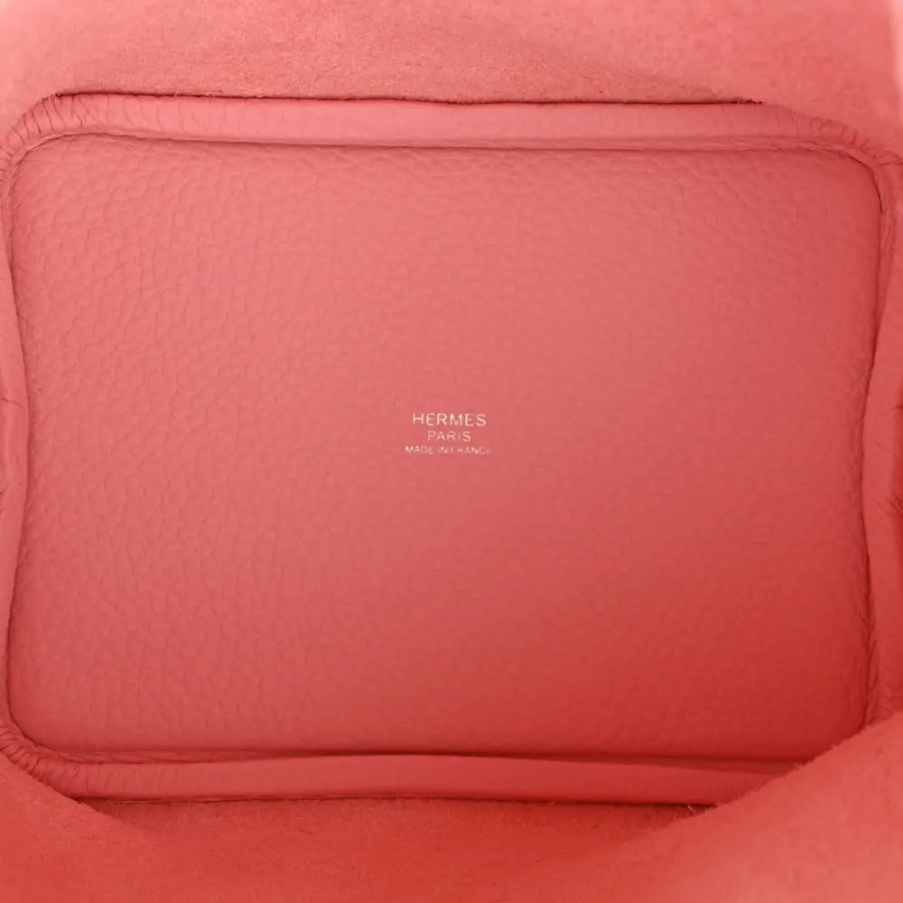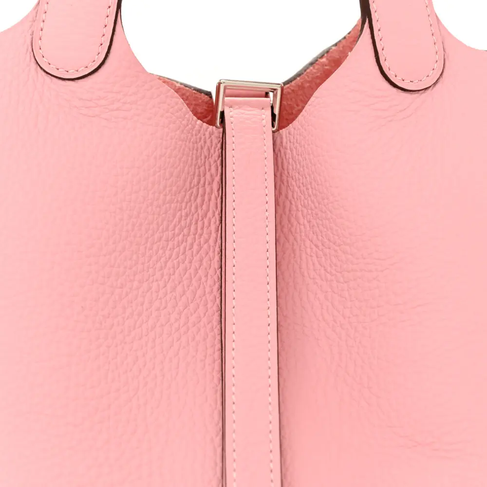 This Hermès Picotin Lock 18 PM in Rose Sakura Taurillon Clemence Leather is a charming accessory. The soft pink tone is paired with palladium hardware for a feminine touch. Its open-top design offers easy access to essentials. Compact yet spacious, it’s perfect for everyday use. A versatile addition to your Hermès collection. Add a touch of elegance to your wardrobe.