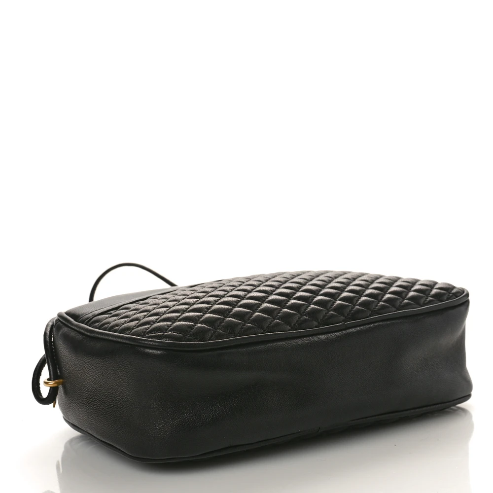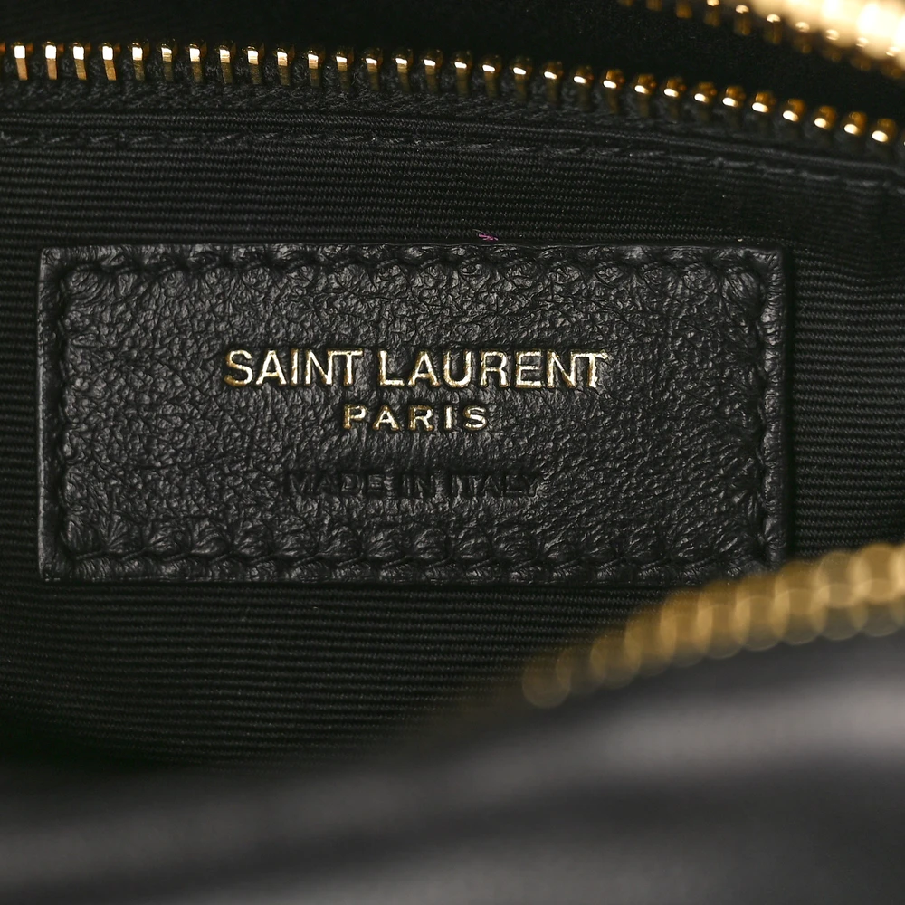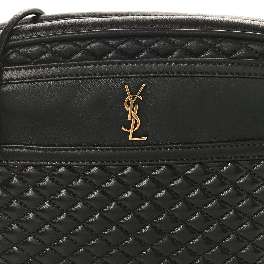 This Small Victoire Camera Bag in Black features luxurious Quilted Lambskin Leather paired with gold hardware. Its compact design is ideal for carrying essentials, offering an adjustable strap for crossbody convenience. The sophisticated quilting pattern and iconic YSL logo make it a timeless addition to any wardrobe. A versatile choice, this bag easily transitions from casual outings to more formal occasions.