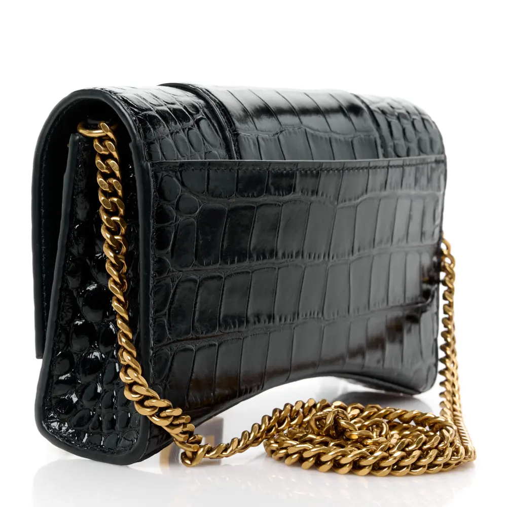 This Balenciaga XS Hourglass Chain Bag in Black exudes sophistication with its crocodile-embossed shiny calfskin leather and gold hardware accents. Its structured silhouette is complemented by the signature curved base for a modern, edgy look. Perfectly sized for daily essentials, it offers a secure flap closure and detachable chain strap for versatile carrying options. The timeless black design ensures easy pairing with any outfit, while the luxurious leather adds a refined touch. A true reflection of Balenciaga’s innovative craftsmanship, this piece is a wardrobe staple.