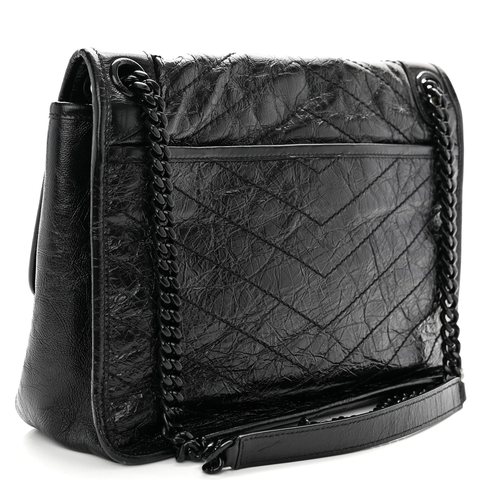 This Medium Niki Chain Satchel in Black combines Crinkled Monogram Calfskin Matelasse Leather with tonal black hardware for a bold statement. The roomy interior and multiple compartments provide functionality without compromising on style. Its chain strap offers versatility for shoulder or crossbody wear. A striking choice for those who appreciate edgy sophistication.