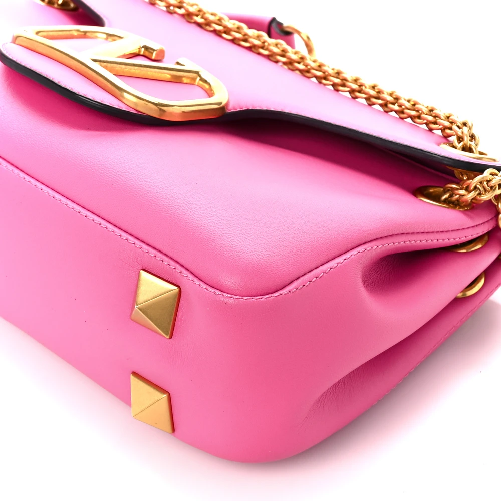 This Valentino Garavani Medium Stud Sign Shoulder Bag in Feminine Pink is elegant. Nappa leather with gold hardware ensures a polished look. Spacious enough for everyday essentials. Stud detailing adds an edgy yet sophisticated vibe. Perfect for casual or semi-formal occasions. A timeless piece for modern women.