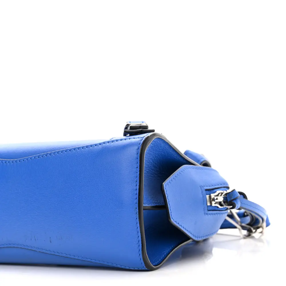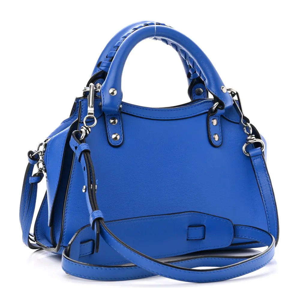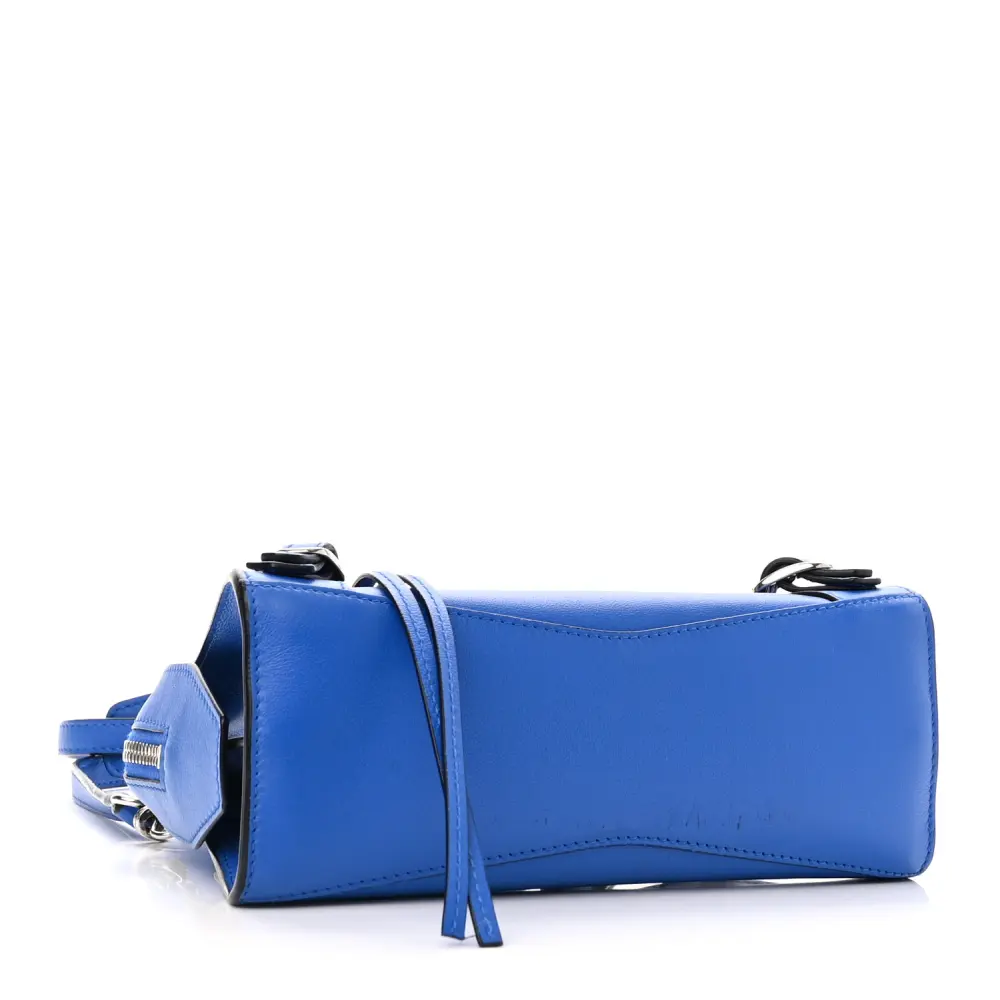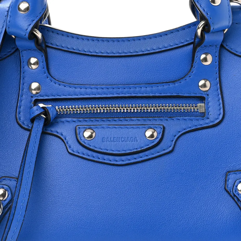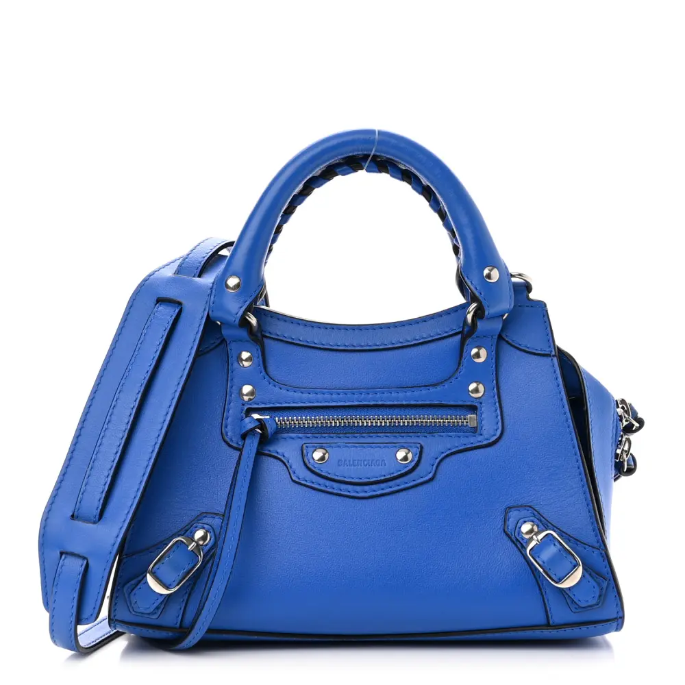 This Balenciaga Mini Neo Classic City Bag in Bleu features smooth calfskin leather, delivering a refined finish with silver hardware. Its compact size makes it ideal for daily use while maintaining an elegant aesthetic. The structured design is complemented by signature buckle accents for a modern twist. A detachable crossbody strap ensures versatile styling options. Elevate your wardrobe with this sophisticated and functional piece.