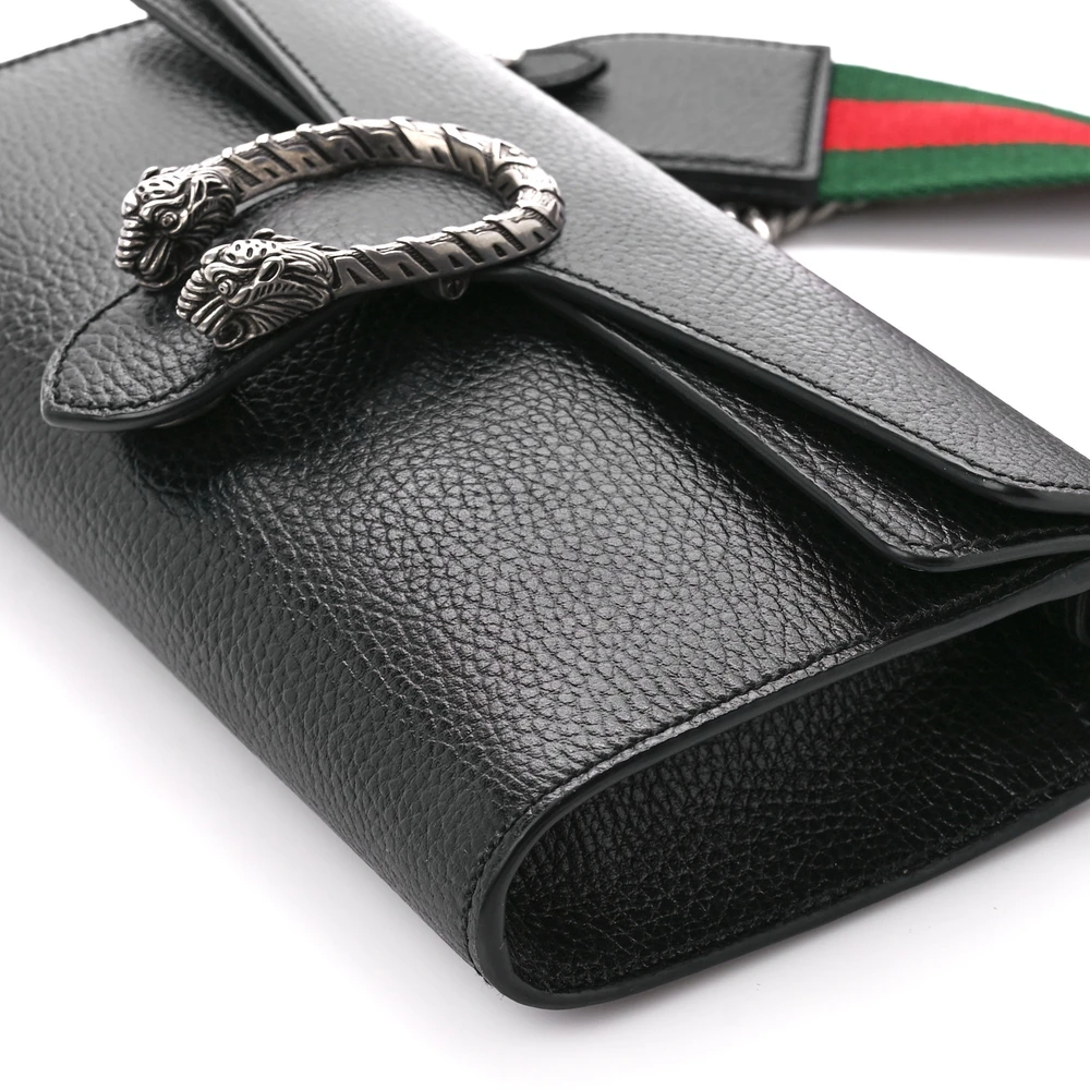 This Gucci Small Web Dionysus Crossbody Bag is crafted in black dollar calfskin leather. The ruthenium hardware adds a sophisticated contrast. It features Gucci’s iconic web detail for timeless style. The compact size makes it ideal for daily use or evening outings. The adjustable strap enhances convenience. A statement piece with signature Gucci elegance.