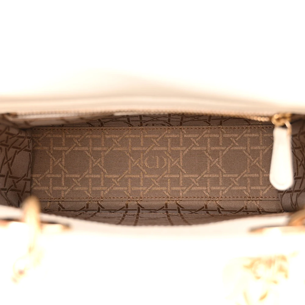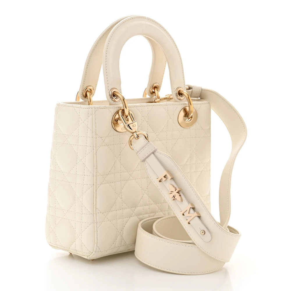 This Dior Small My ABCDior Lady Dior in White Cannage Lambskin Leather exudes classic charm. The gold hardware adds a touch of luxury to its compact design. A customizable charm feature offers a personal touch, making it perfect for unique expressions of style.