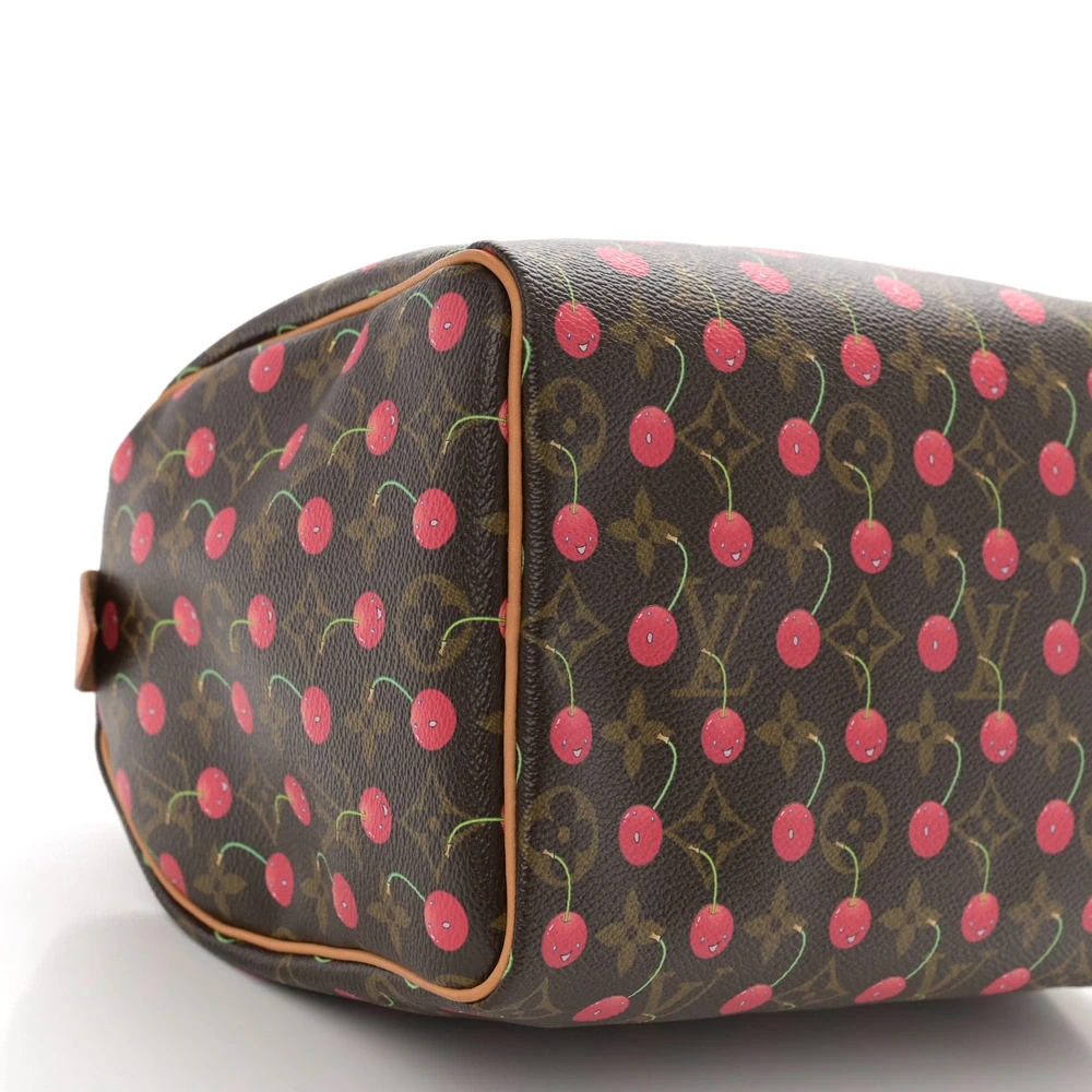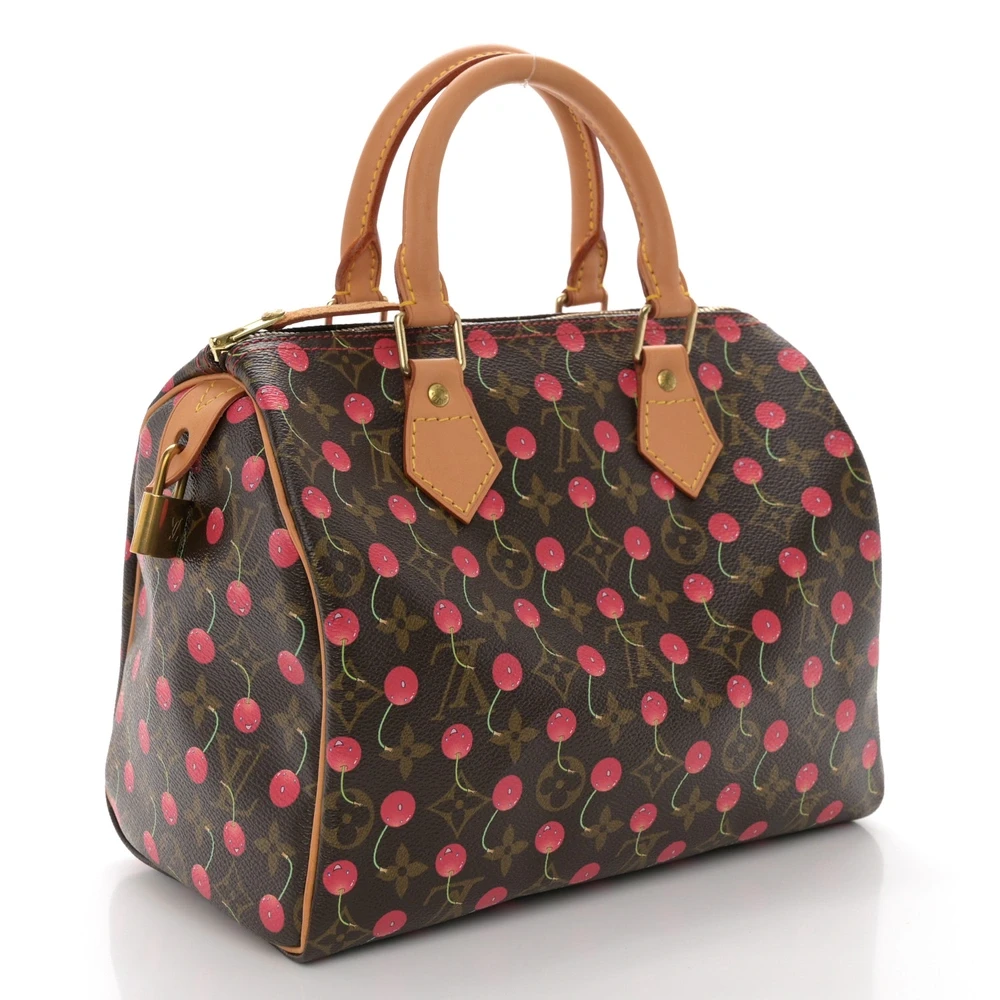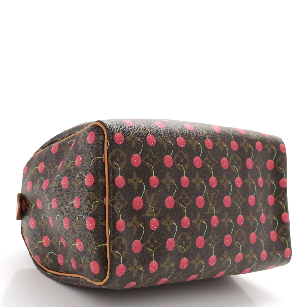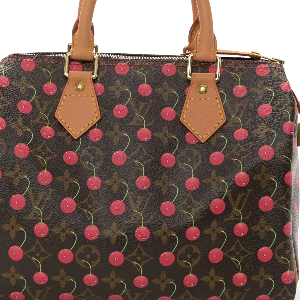 This Louis Vuitton Monogram Canvas Cerises Speedy 25 is a playful and limited-edition version of the classic Speedy. Featuring the iconic monogram canvas with a cherry motif, it’s accented with gold hardware. The interior is lined with red fabric, adding a vibrant touch to this fun yet functional bag.