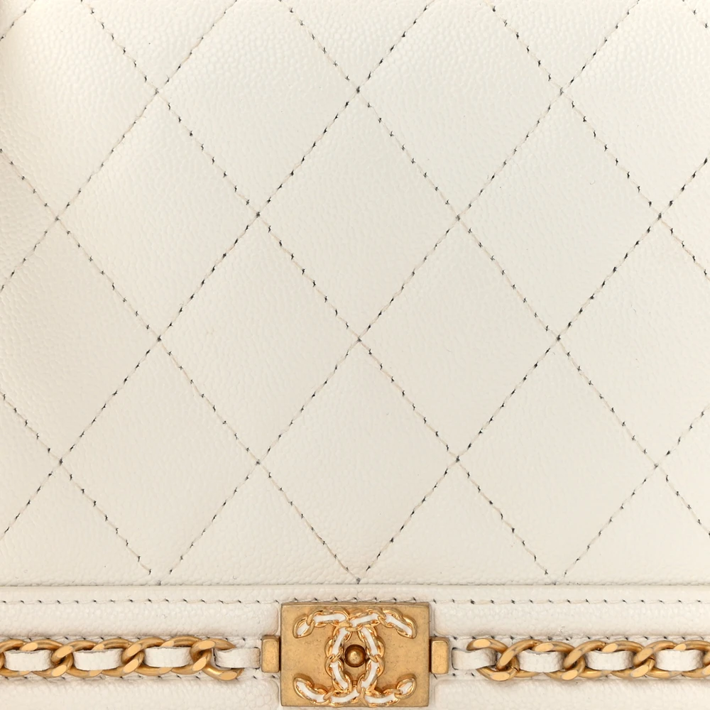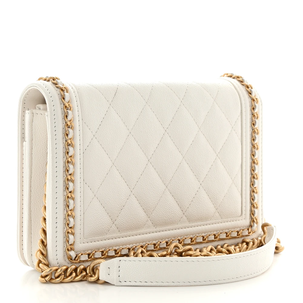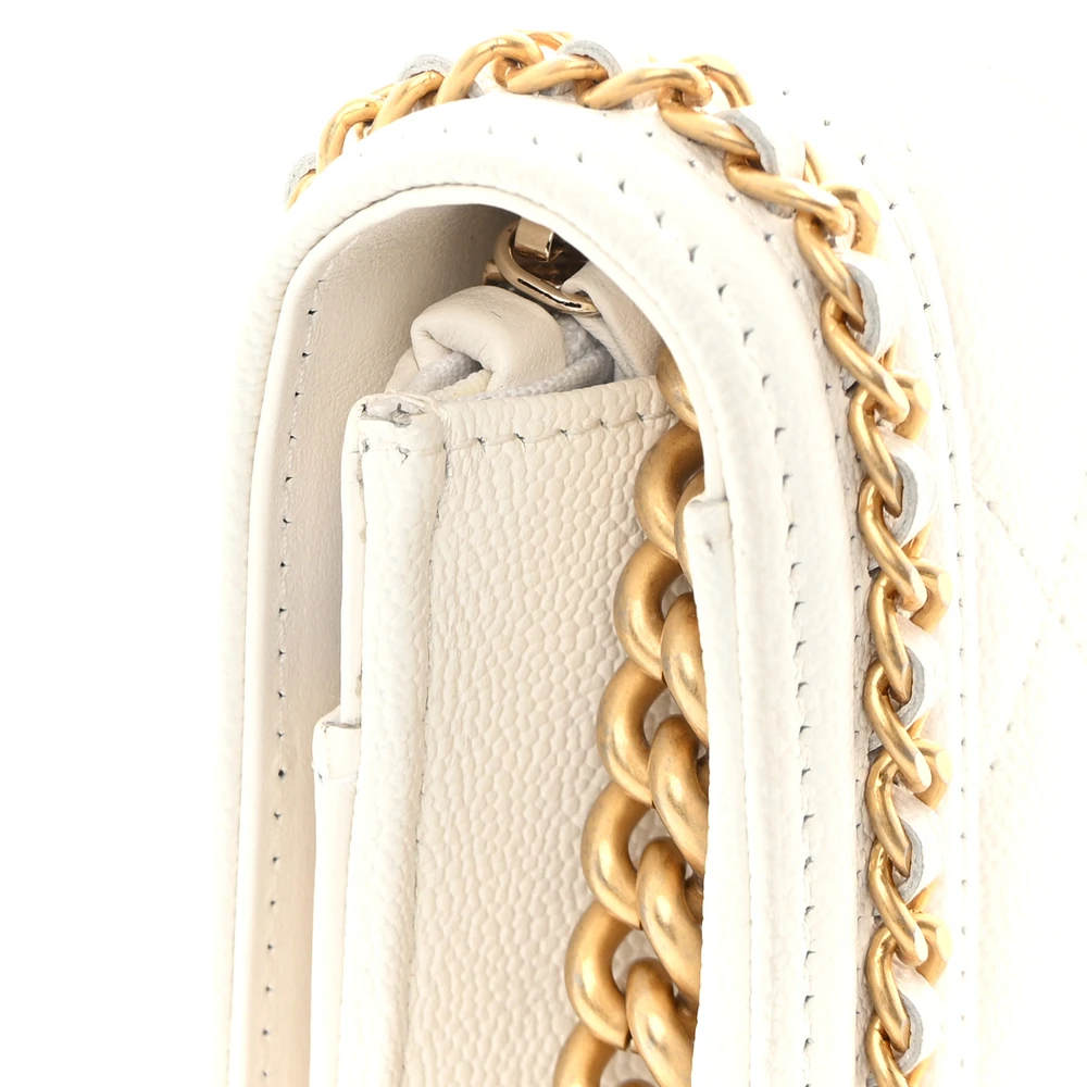 This Chanel Chain Around Boy Wallet On Chain (WOC) Small in White Quilted Caviar Leather with Silver Hardware is a modern and stylish accessory. The durable caviar leather showcases Chanel’s iconic quilting. Silver hardware adds a sleek contrast to the white design. Compact yet functional, it’s perfect for carrying cards and small essentials. The chain strap offers versatile carrying options. A chic choice for day or night.