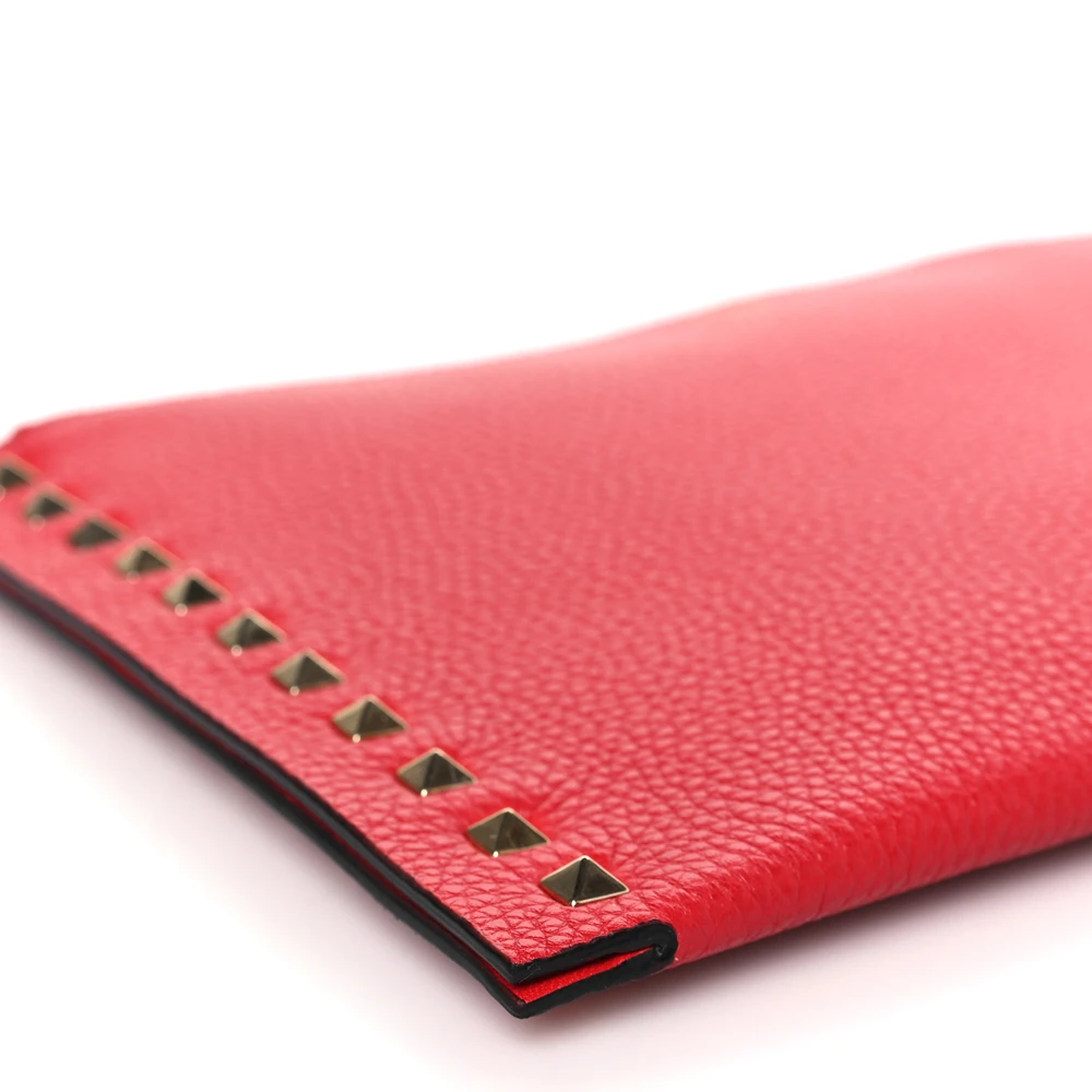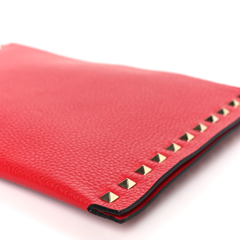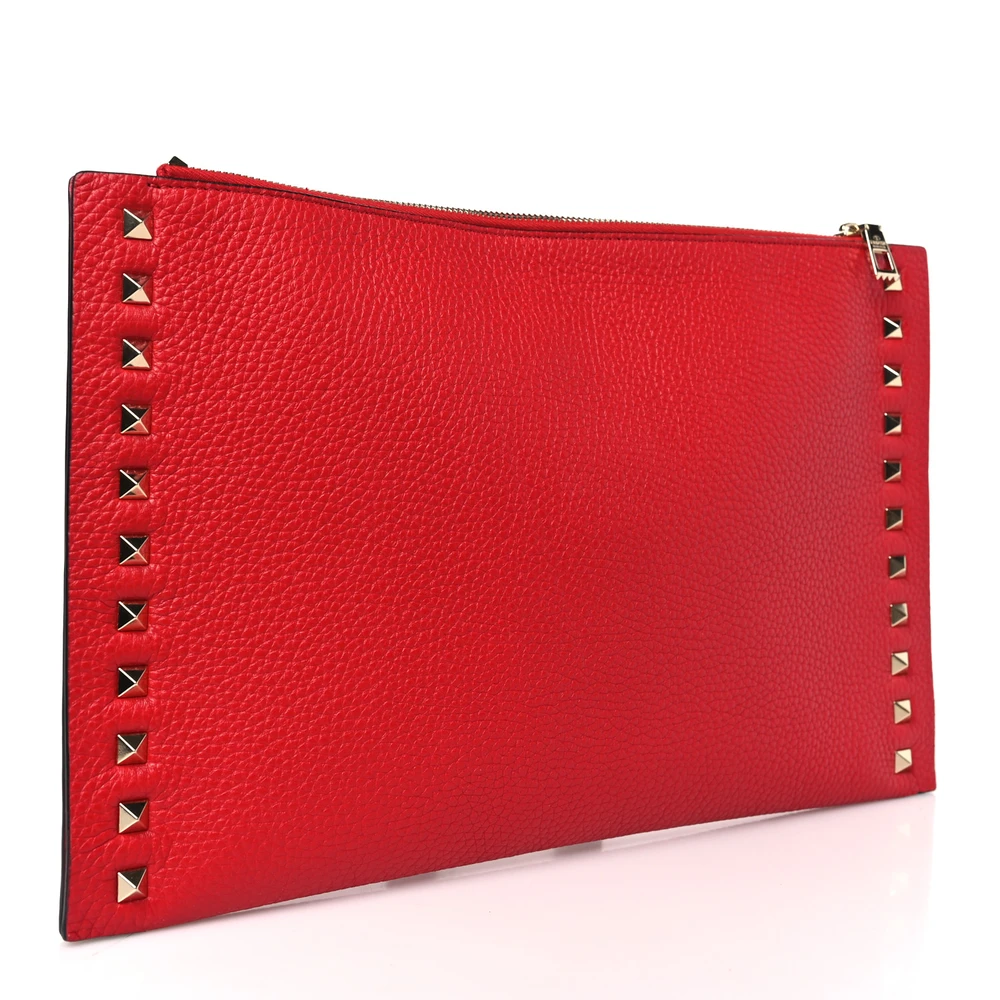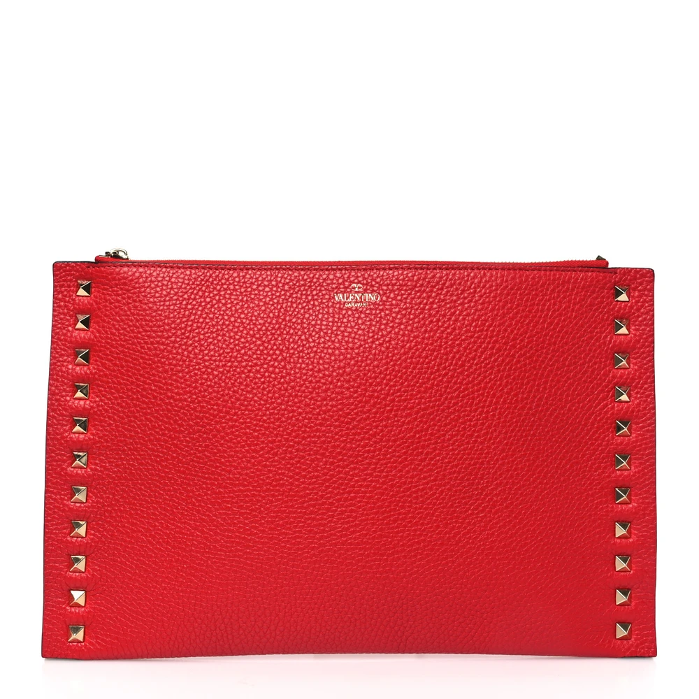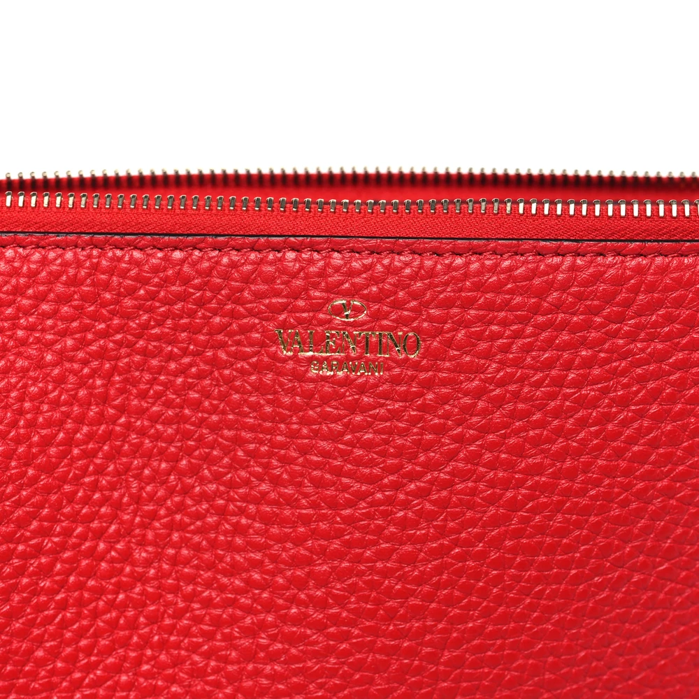 This Valentino Garavani Large Rockstud Flat Zip Pouch in Rouge Pur is sleek and functional. Pebbled calfskin leather with gold hardware creates a polished look. Compact design for carrying essentials. Rockstud accents add a bold edge. Perfect for casual or formal events.