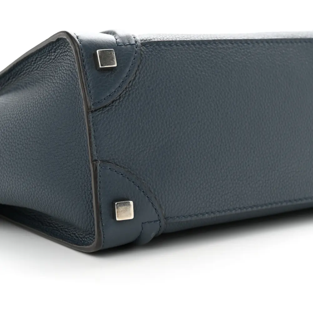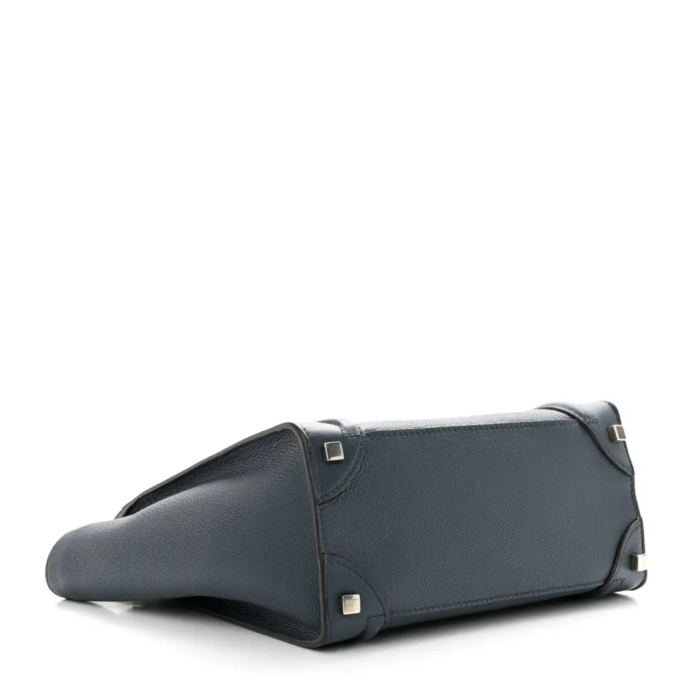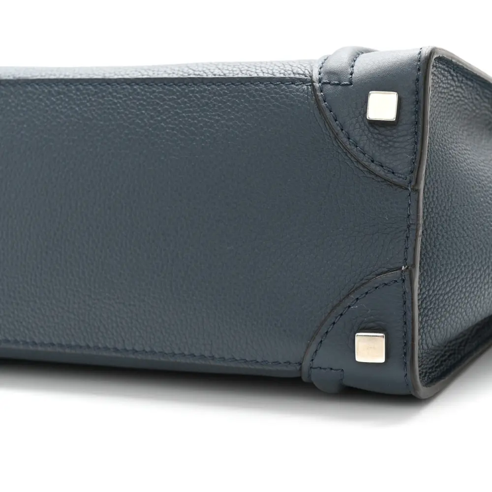 This Celine Micro Luggage Bag in Petrol features baby drummed calfskin leather. Its structured silhouette offers spacious compartments for everyday use. The top handles add a classic touch. A stylish and practical choice for on-the-go individuals.