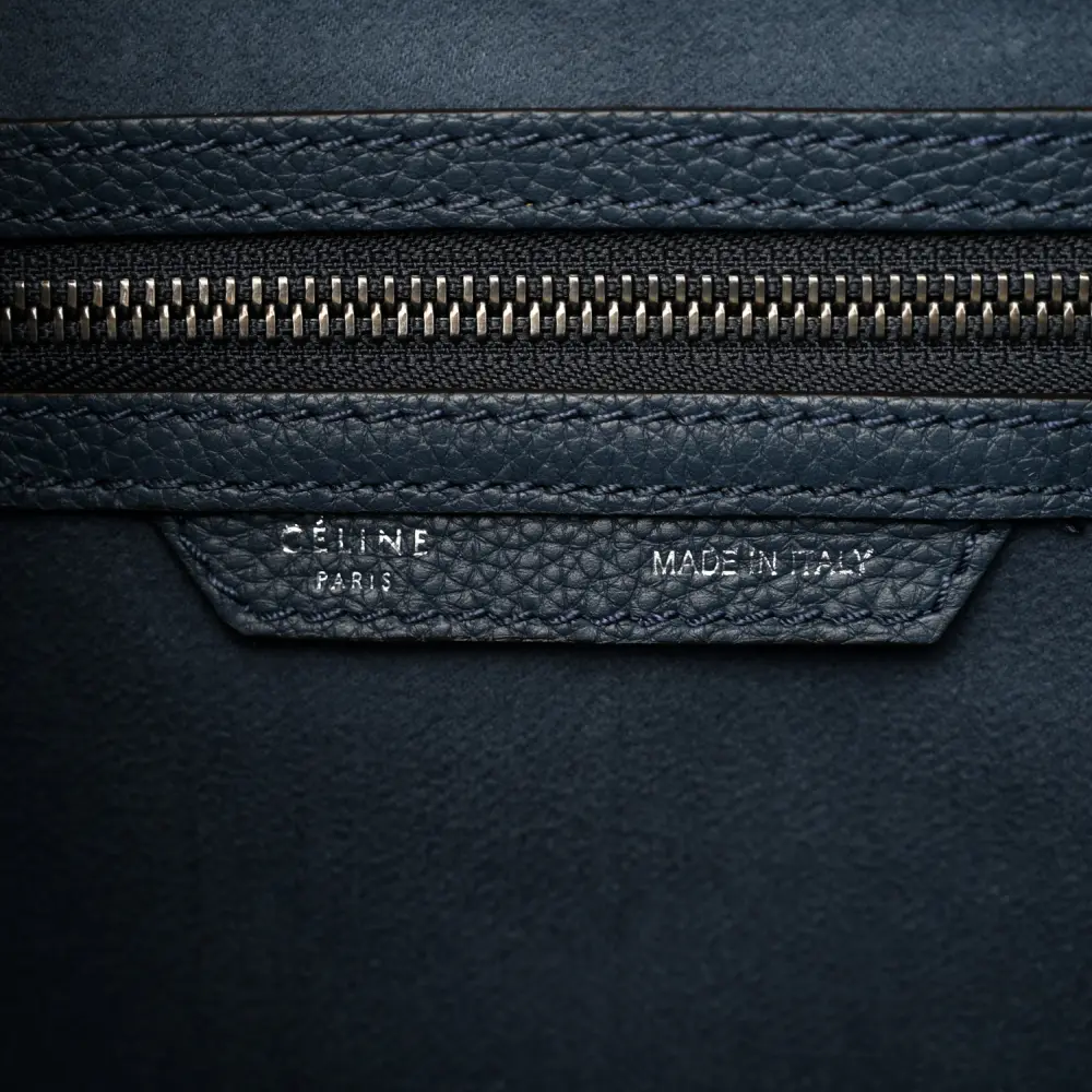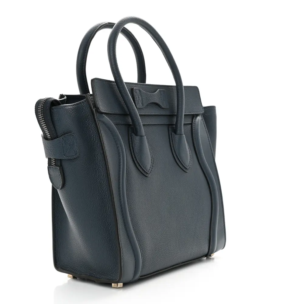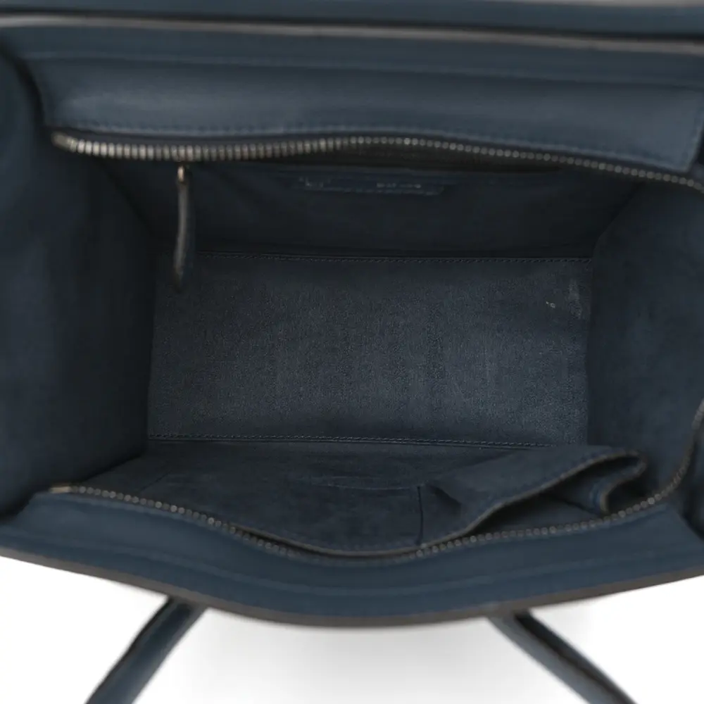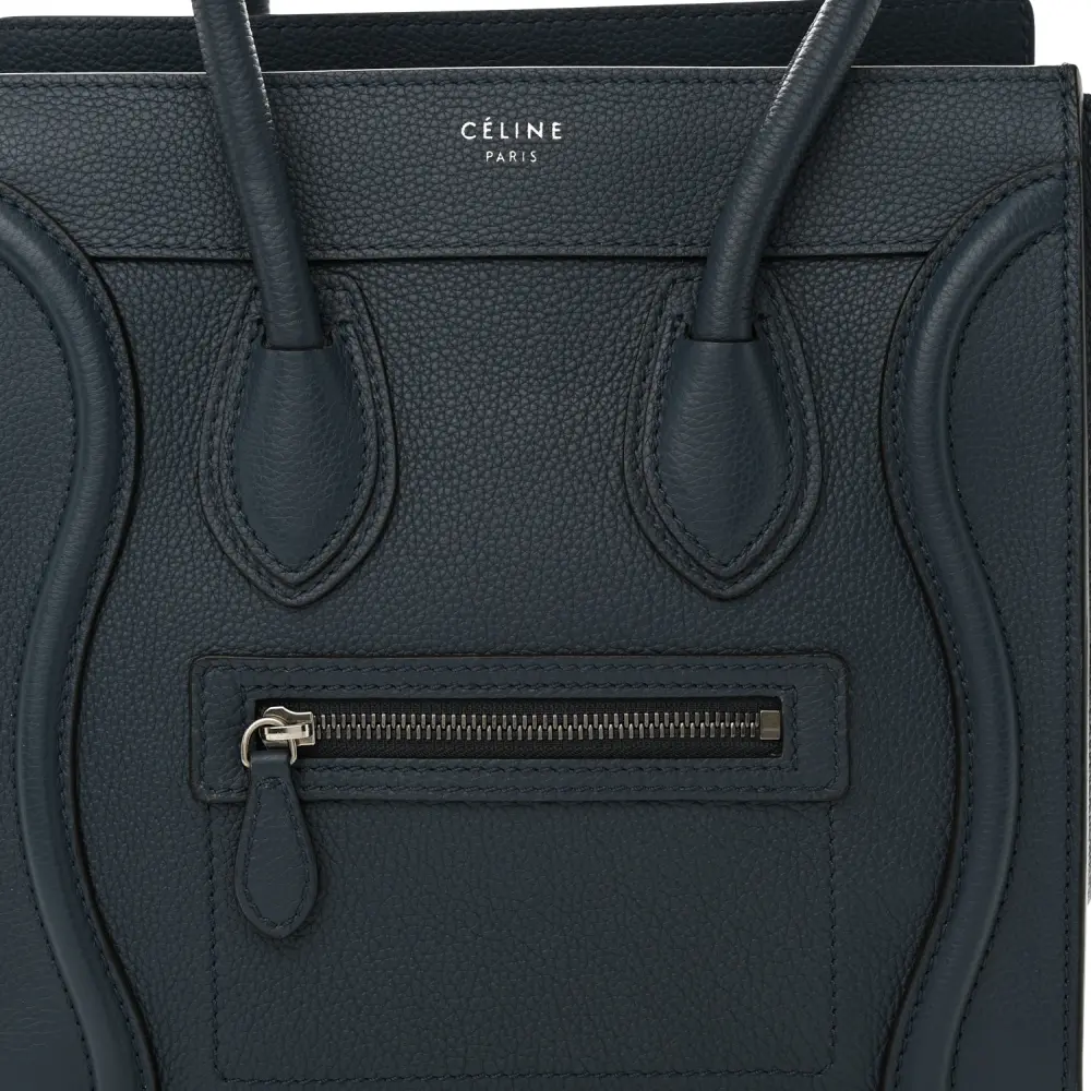 This Celine Micro Luggage Bag in Petrol features baby drummed calfskin leather. Its structured silhouette offers spacious compartments for everyday use. The top handles add a classic touch. A stylish and practical choice for on-the-go individuals.