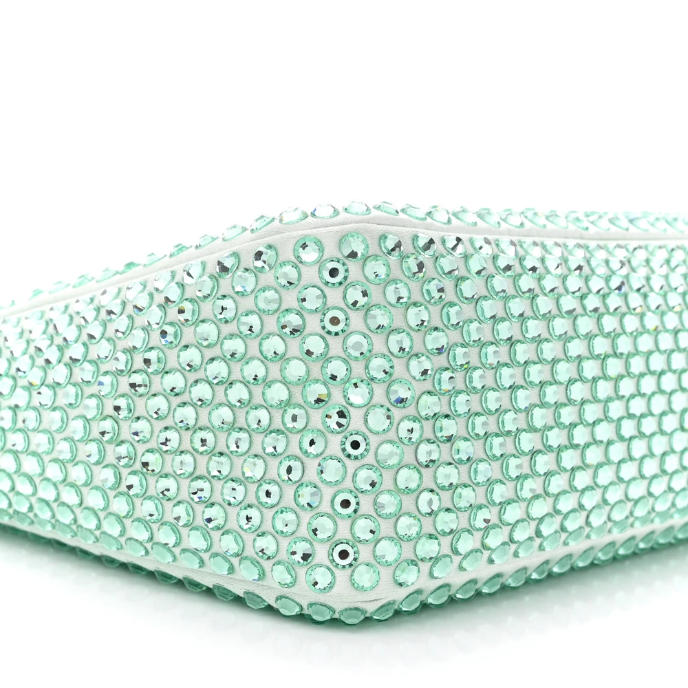 This Prada Mini Re-Edition 2000 Bag in Acqua features satin and crystal materials. Compact size for evening essentials. Silver hardware adds a luxurious touch. A sparkling accessory for glamorous occasions. Lightweight and easy to carry. Perfect for adding elegance to your look.