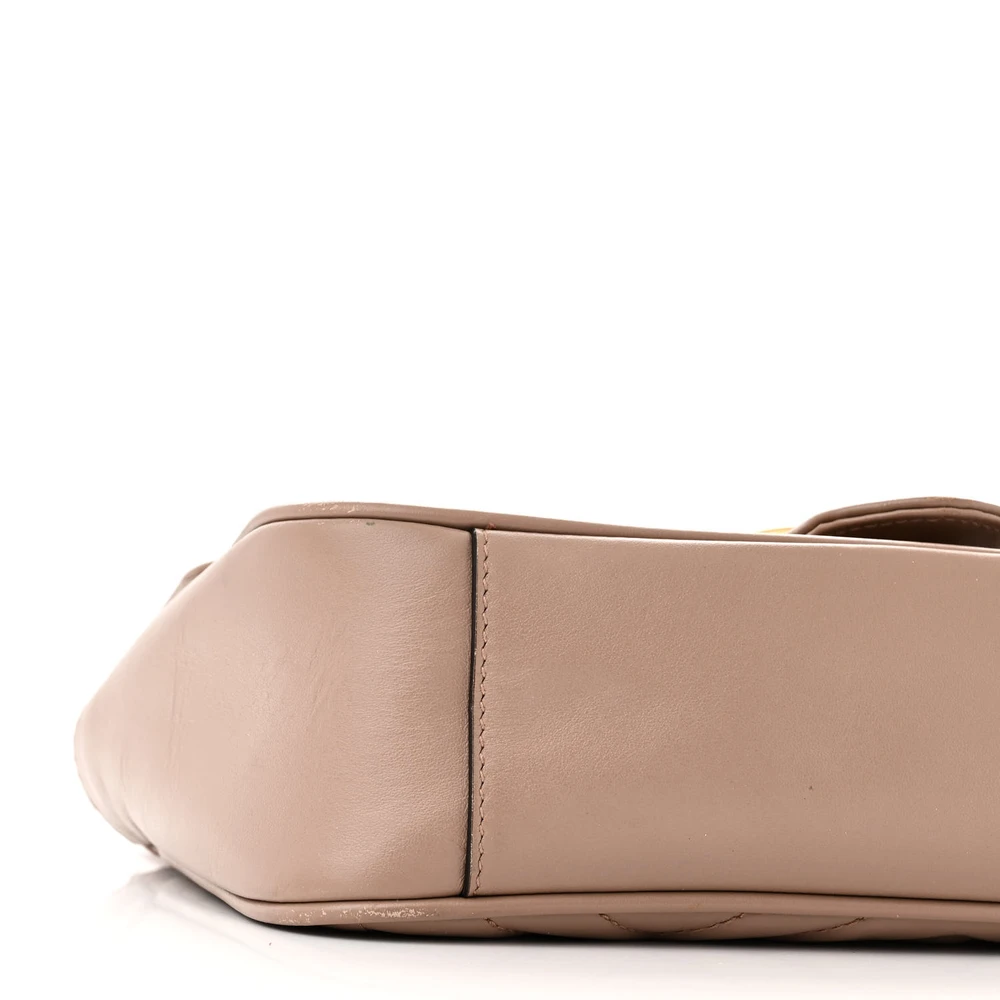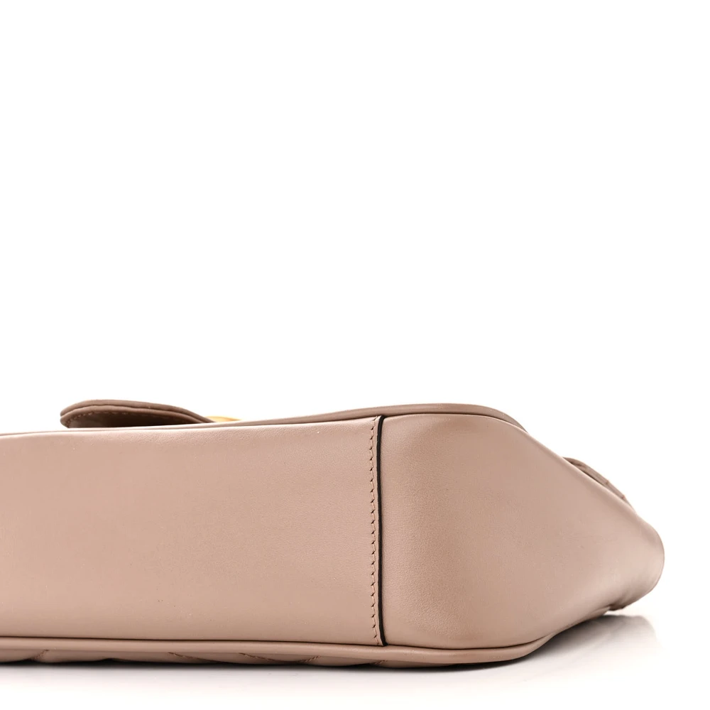 This Gucci Small GG Marmont Shoulder Bag comes in porcelain rose calfskin matelassé leather. Gold hardware enhances its elegant aesthetic. Iconic GG logo adds timeless charm. Spacious interior accommodates daily essentials. A chic accessory for both casual and formal occasions.