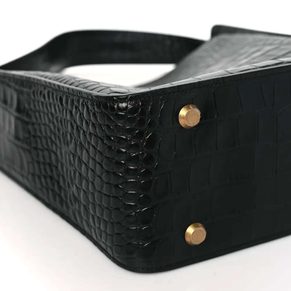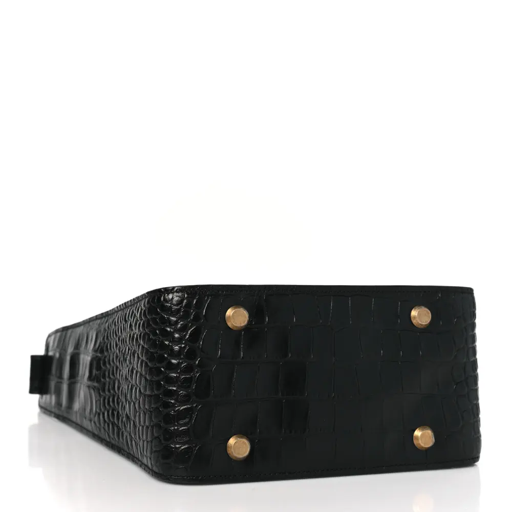This Balenciaga Small Tool 2.0 North-South Tote in Black features crocodile-embossed extra supple calfskin leather for a luxurious touch. Black hardware complements the sleek design, creating an effortlessly chic look. Its compact size is perfect for daily essentials while maintaining a refined aesthetic. Sturdy handles and an optional strap provide versatile carrying options. Perfect for those seeking modern elegance and functionality in a timeless accessory.
