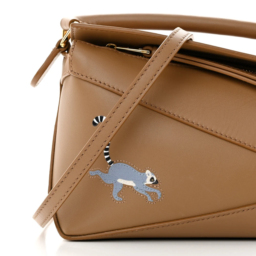 This Loewe x Suna Fujita Lemur Puzzle Edge Bag Mini in Brown features satin calfskin leather with artistic lemur motifs. Compact and stylish, it’s perfect for essentials. The brown tone adds natural charm. Structured yet lightweight, it offers versatile carrying options. A unique and collectible piece. Ideal for adding a playful touch.