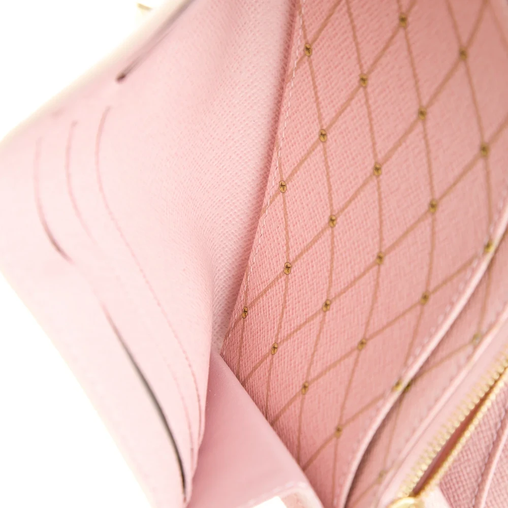 This Louis Vuitton Medium Continental Wallet is a stylish and functional statement piece. Made from pink Damier Azur canvas and calfskin leather, it offers a blend of durability and elegance. The gold hardware complements its chic design, adding a touch of sophistication. Spacious yet sleek, it’s perfect for organizing essentials. This wallet conveys heritage charm with a modern twist.