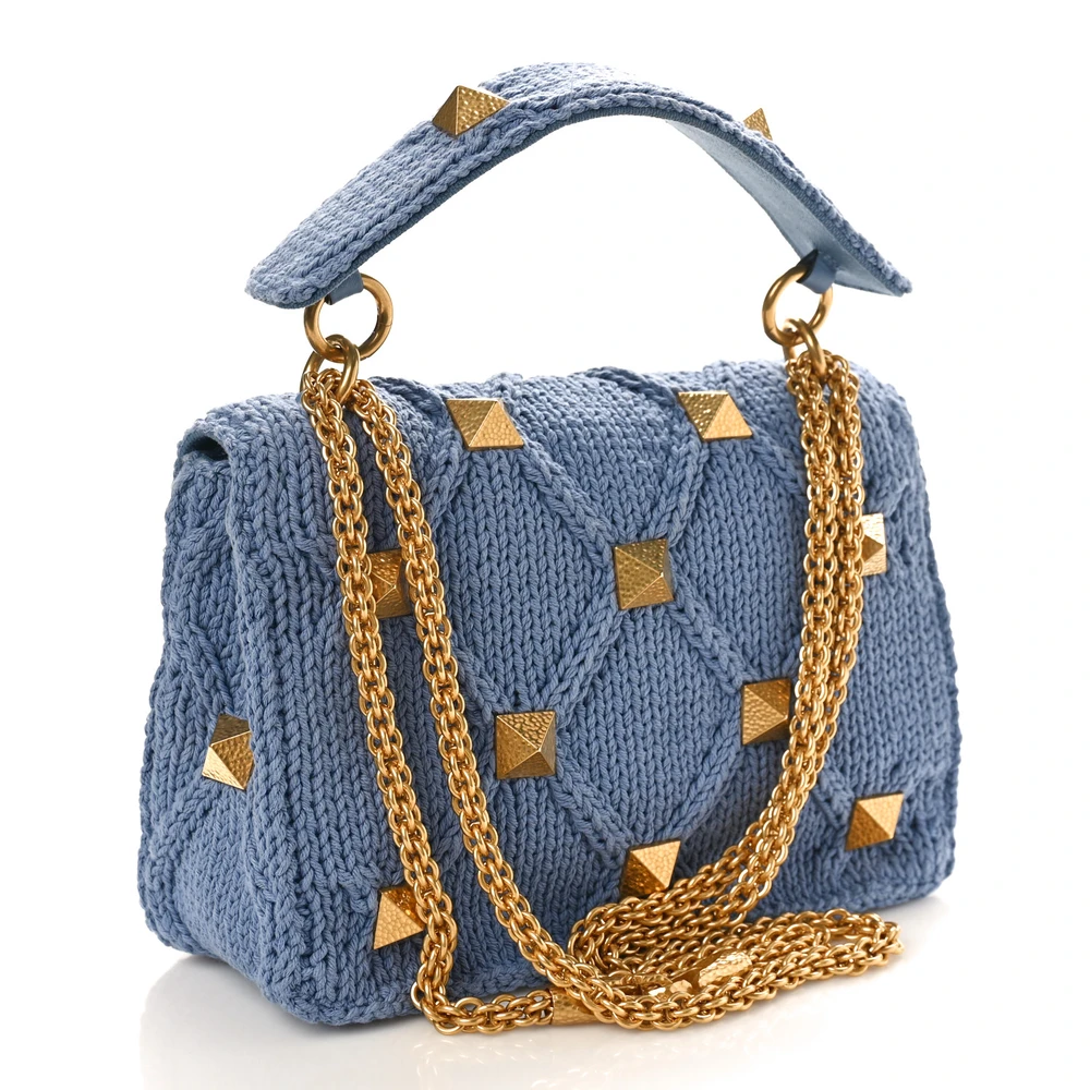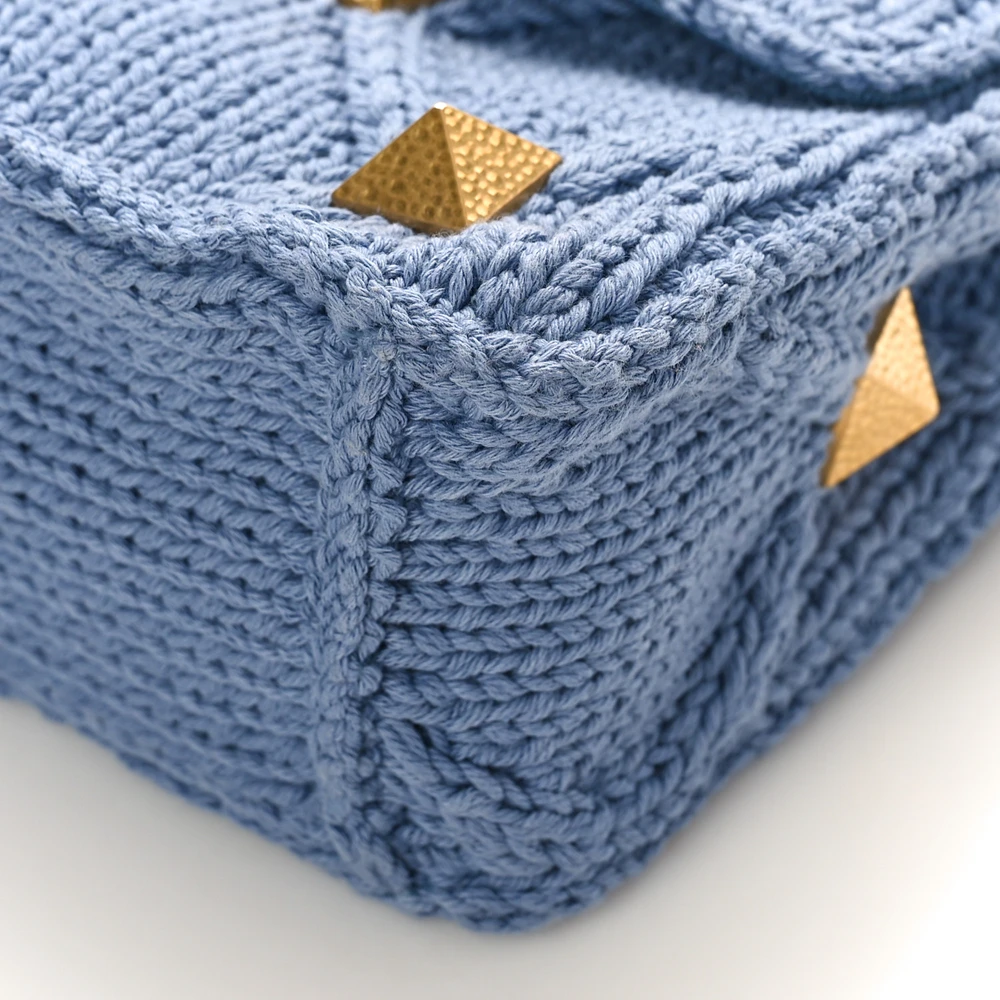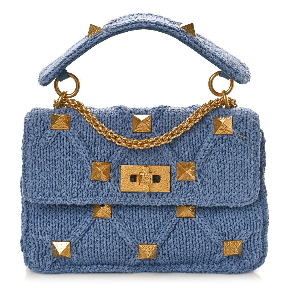 This Valentino Garavani Medium Roman Stud Shoulder Bag in Niagara is stylish and functional. Knit material with gold hardware ensures a modern finish. Spacious enough for daily essentials. Perfect for casual or semi-formal occasions. A versatile accessory for contemporary wardrobes. Blends elegance with practicality.