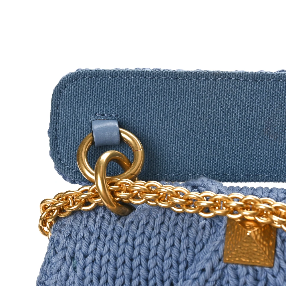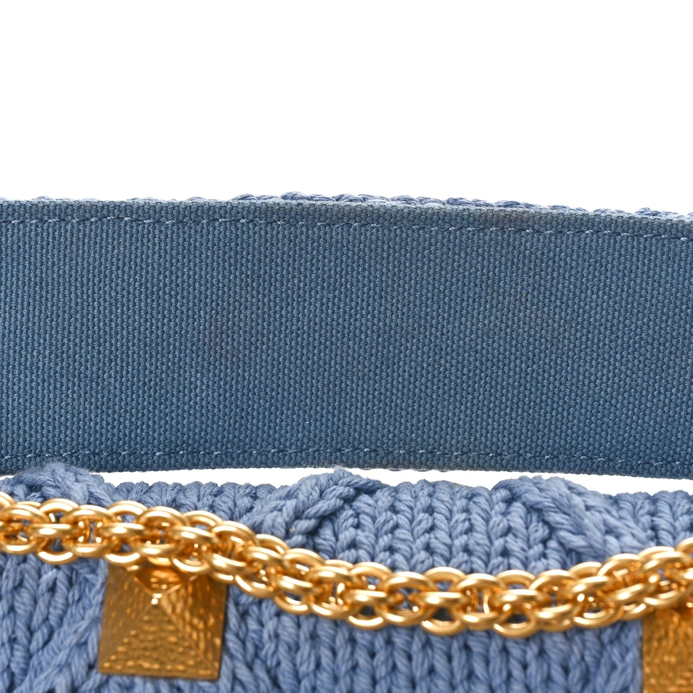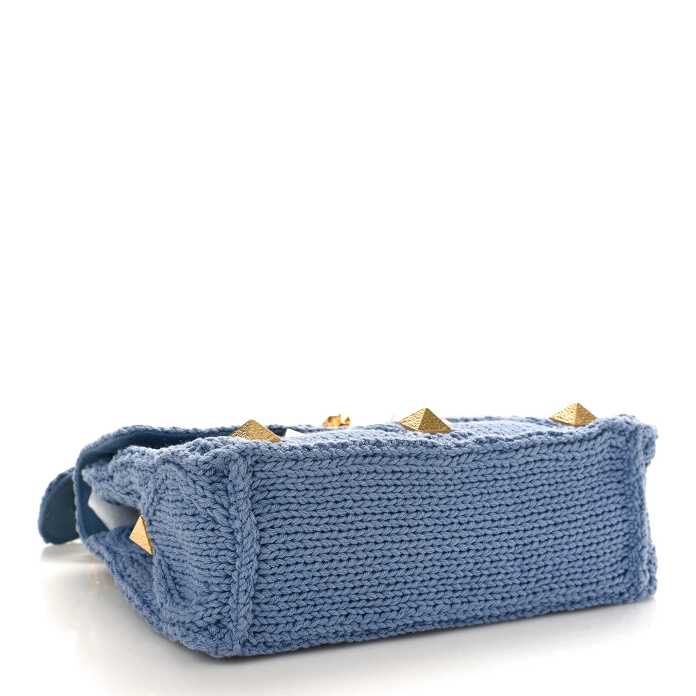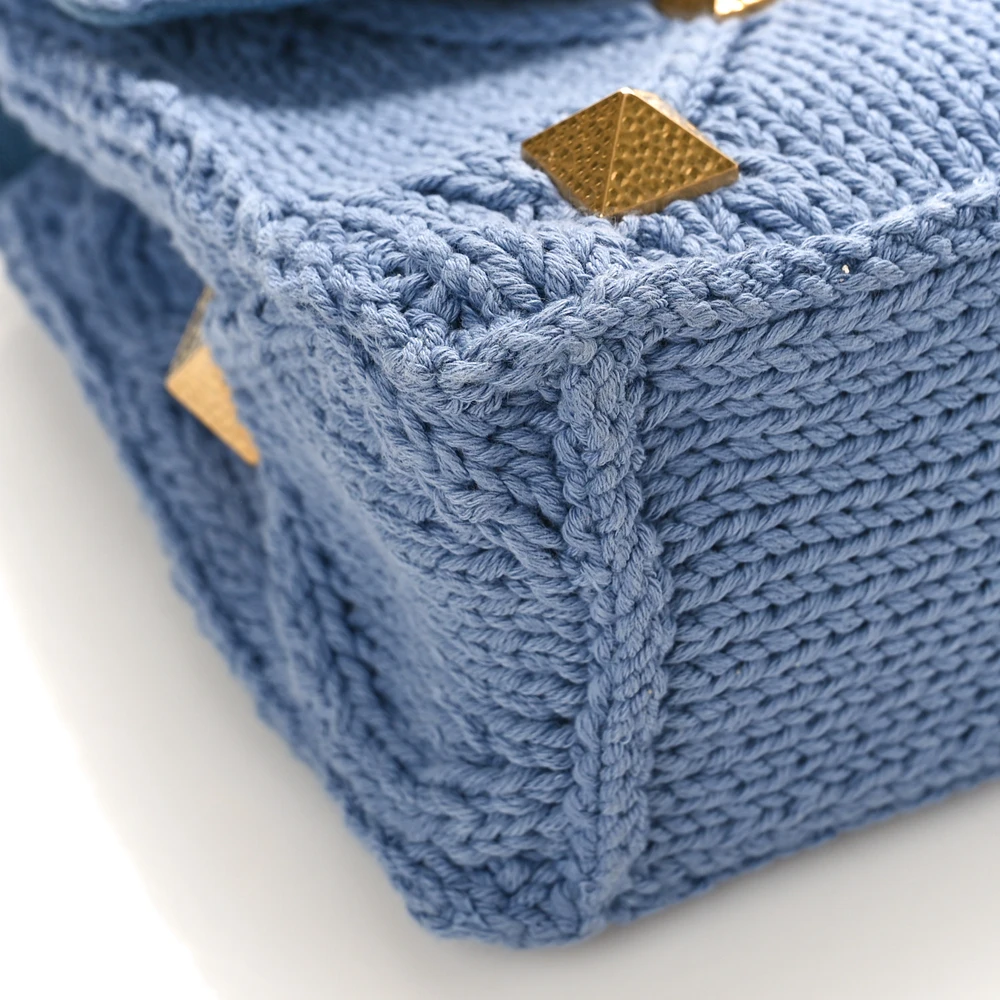 This Valentino Garavani Medium Roman Stud Shoulder Bag in Niagara is stylish and functional. Knit material with gold hardware ensures a modern finish. Spacious enough for daily essentials. Perfect for casual or semi-formal occasions. A versatile accessory for contemporary wardrobes. Blends elegance with practicality.