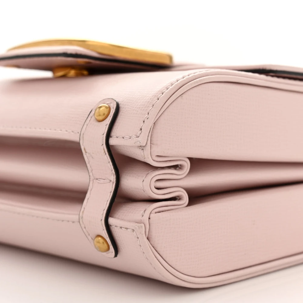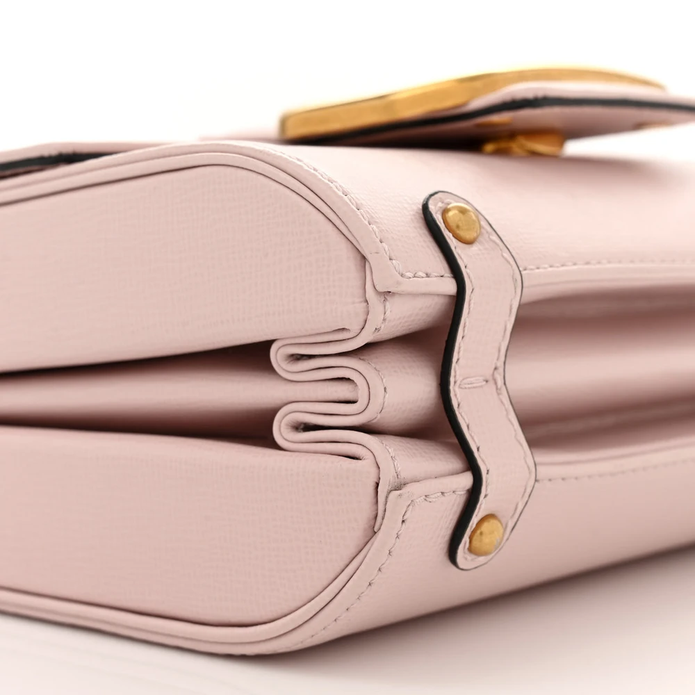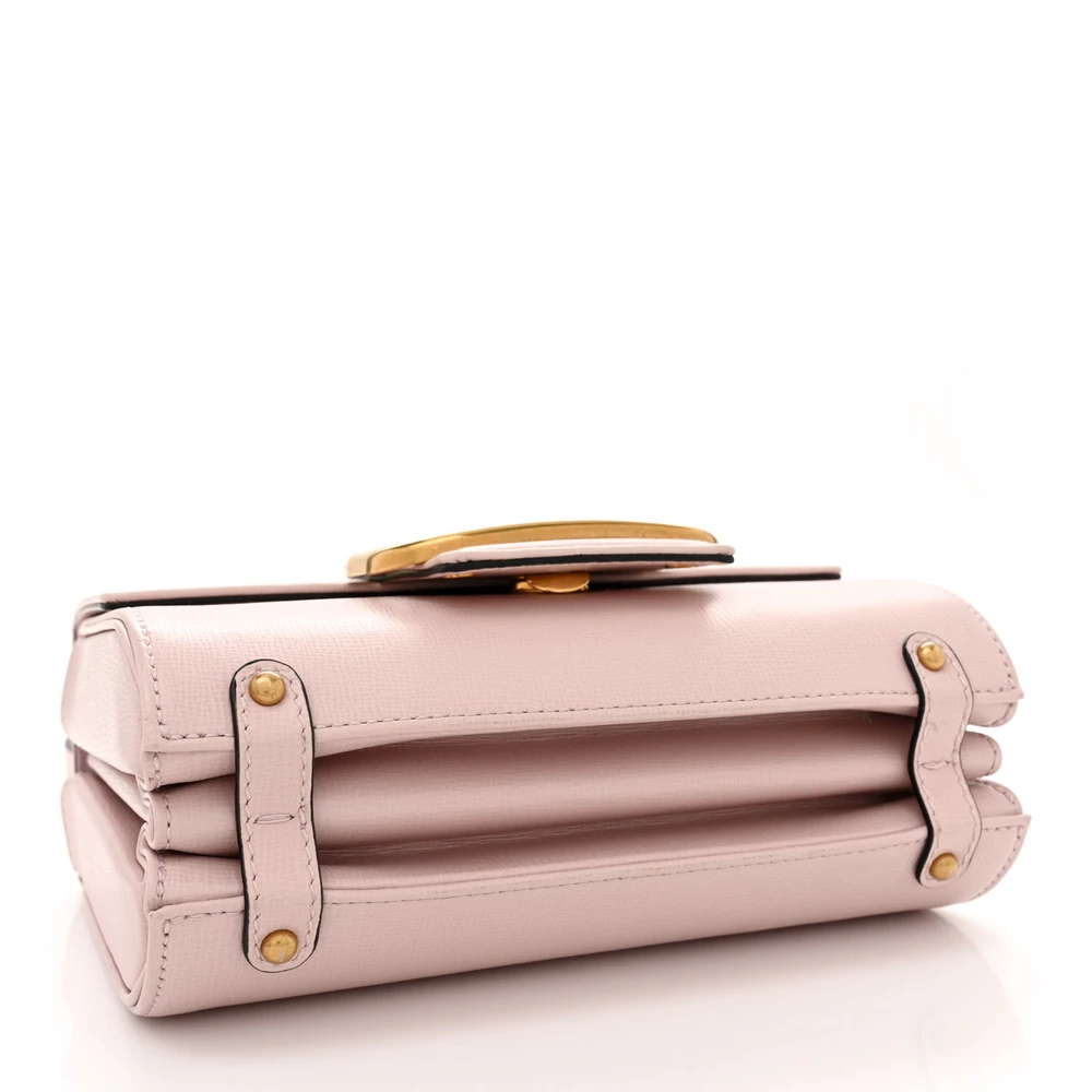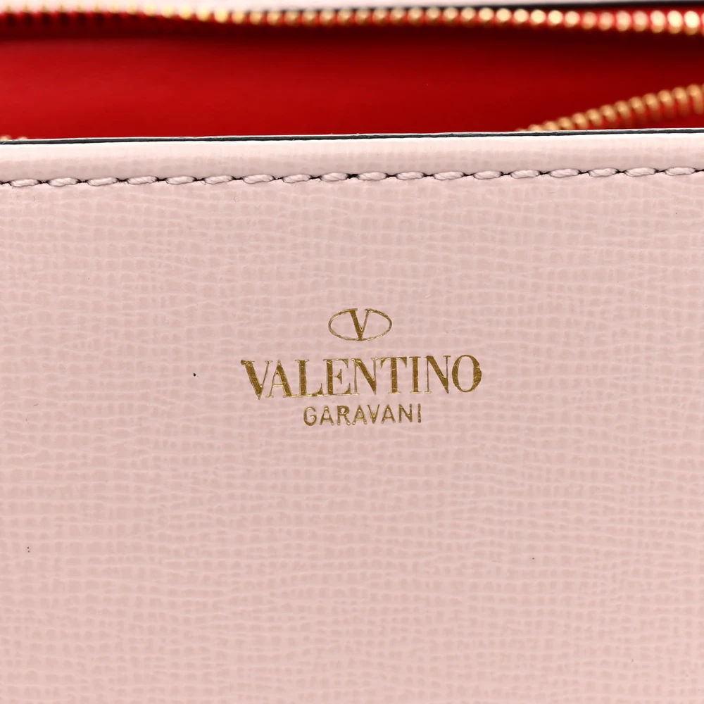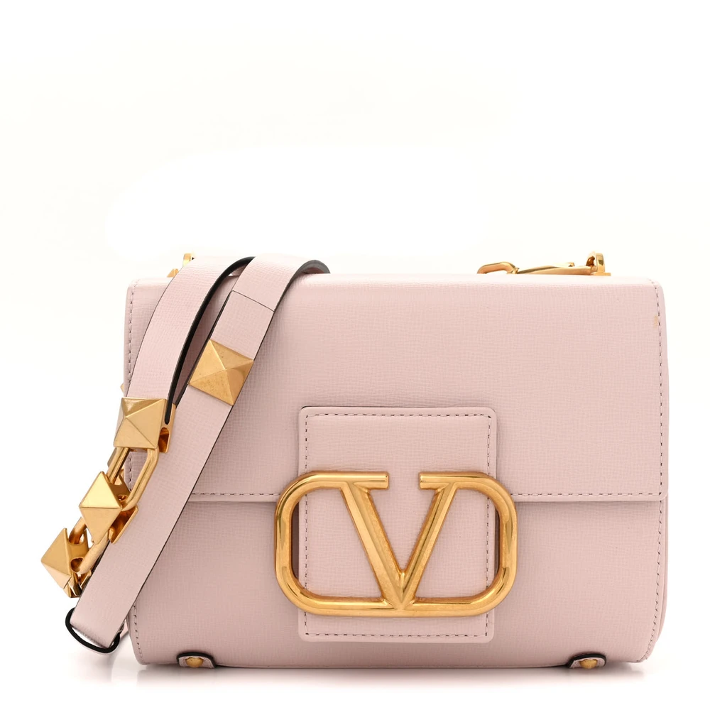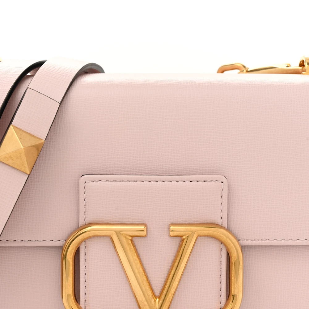This Valentino Garavani Medium Stud Sign Shoulder Bag in Rose Quartz is soft and elegant. Textured calfskin leather with gold hardware offers a polished aesthetic. Spacious enough for all your essentials. Perfect for transitioning from day to night. A timeless addition to your accessory collection. Subtle and sophisticated in design.