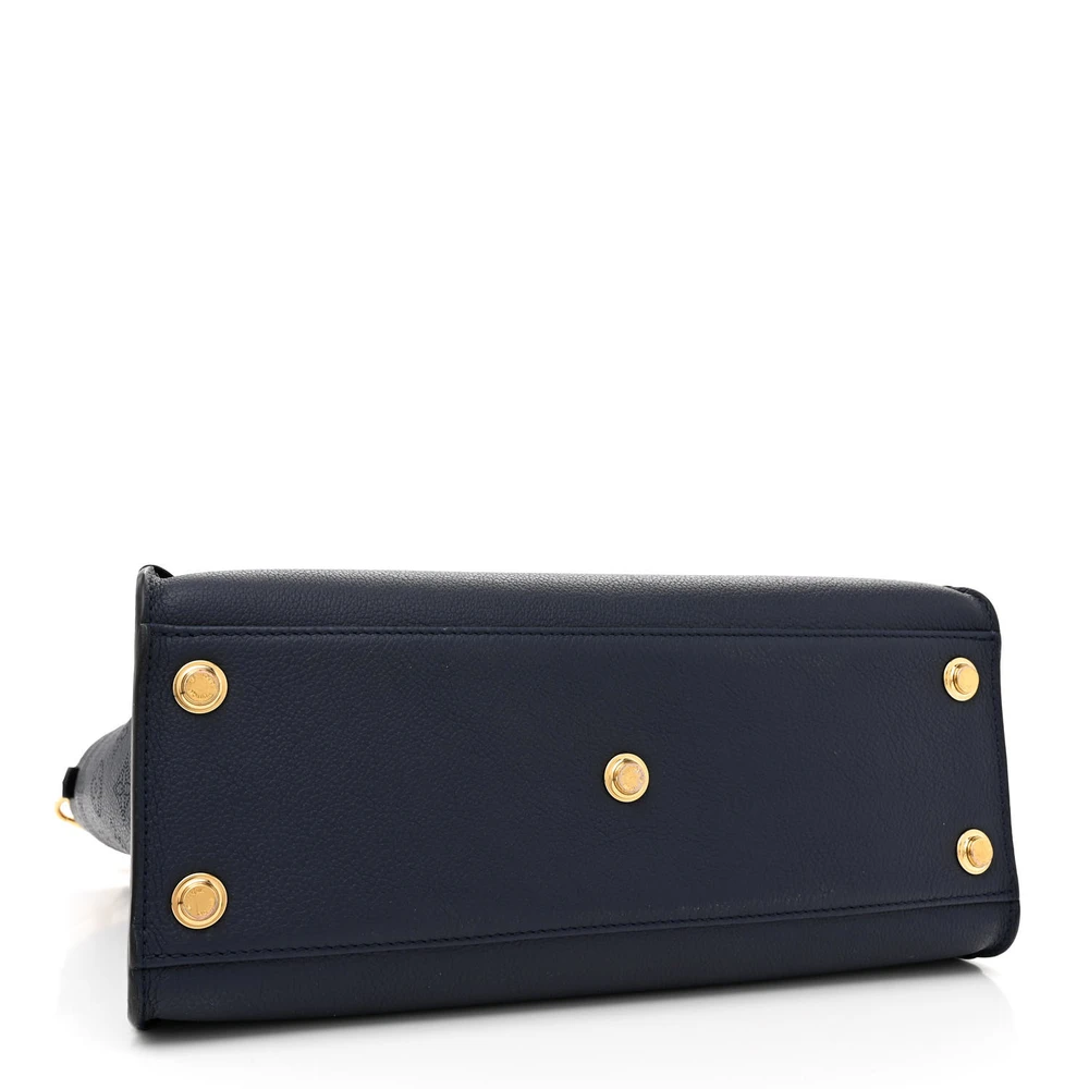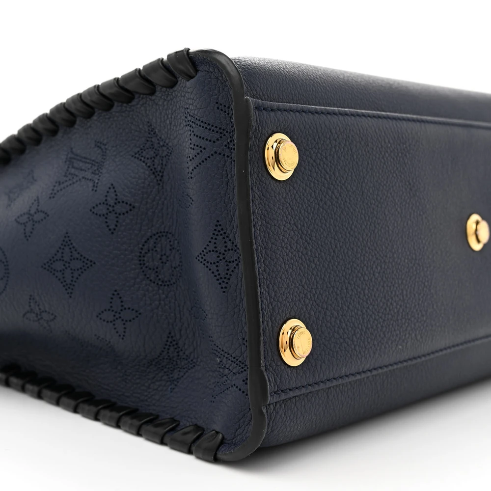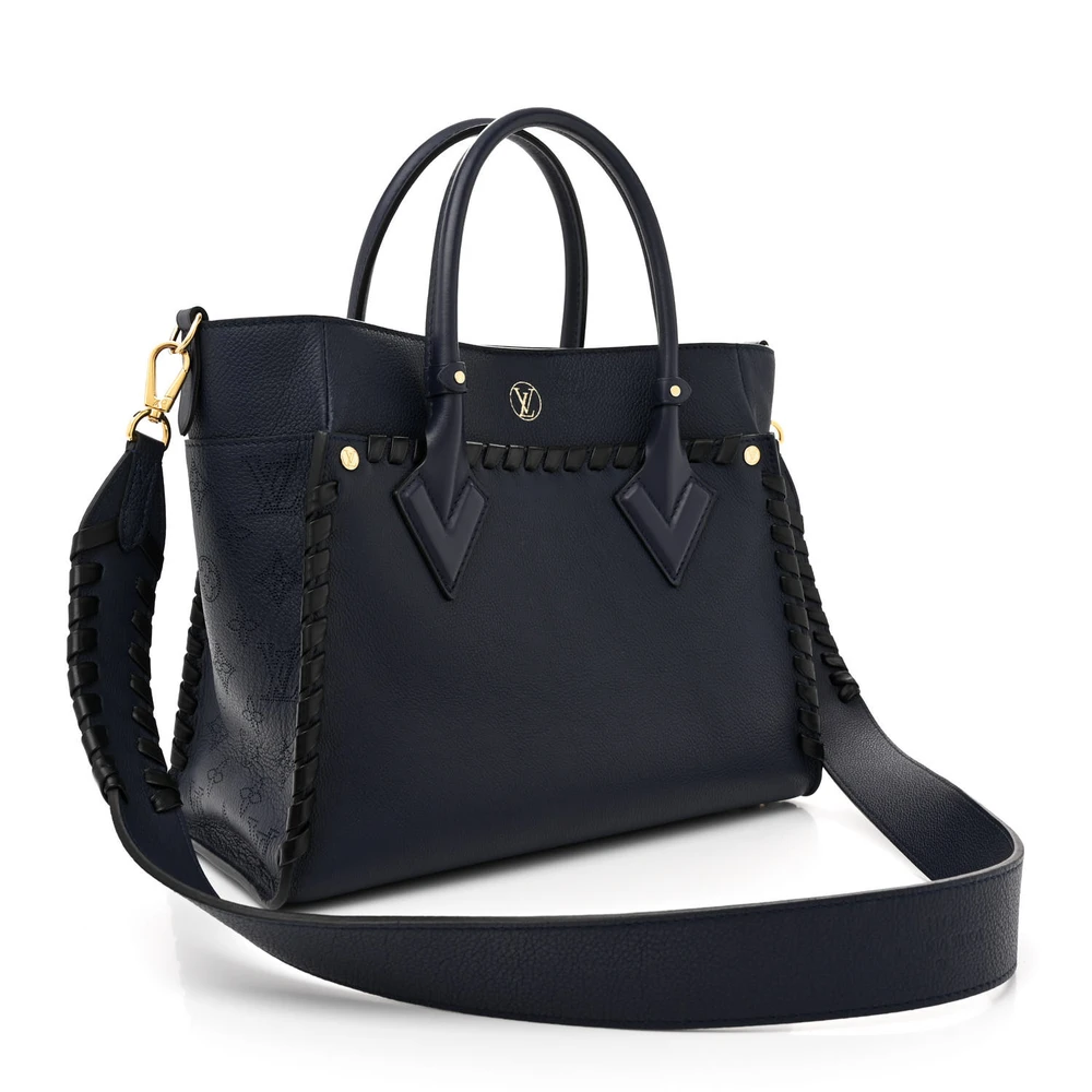 This Louis Vuitton Mahina On My Side MM in Navy is a luxurious and spacious handbag crafted from soft blue calfskin leather. Black whipstitch details and rolled leather handles add texture and sophistication to its design. The adjustable strap offers versatile carrying options, making it perfect for any occasion. Inside, a blue microfiber lining includes zipper and patch pockets for practical organization. The refined silhouette and intricate details elevate its timeless appeal. A must-have for those who value elegance and functionality.