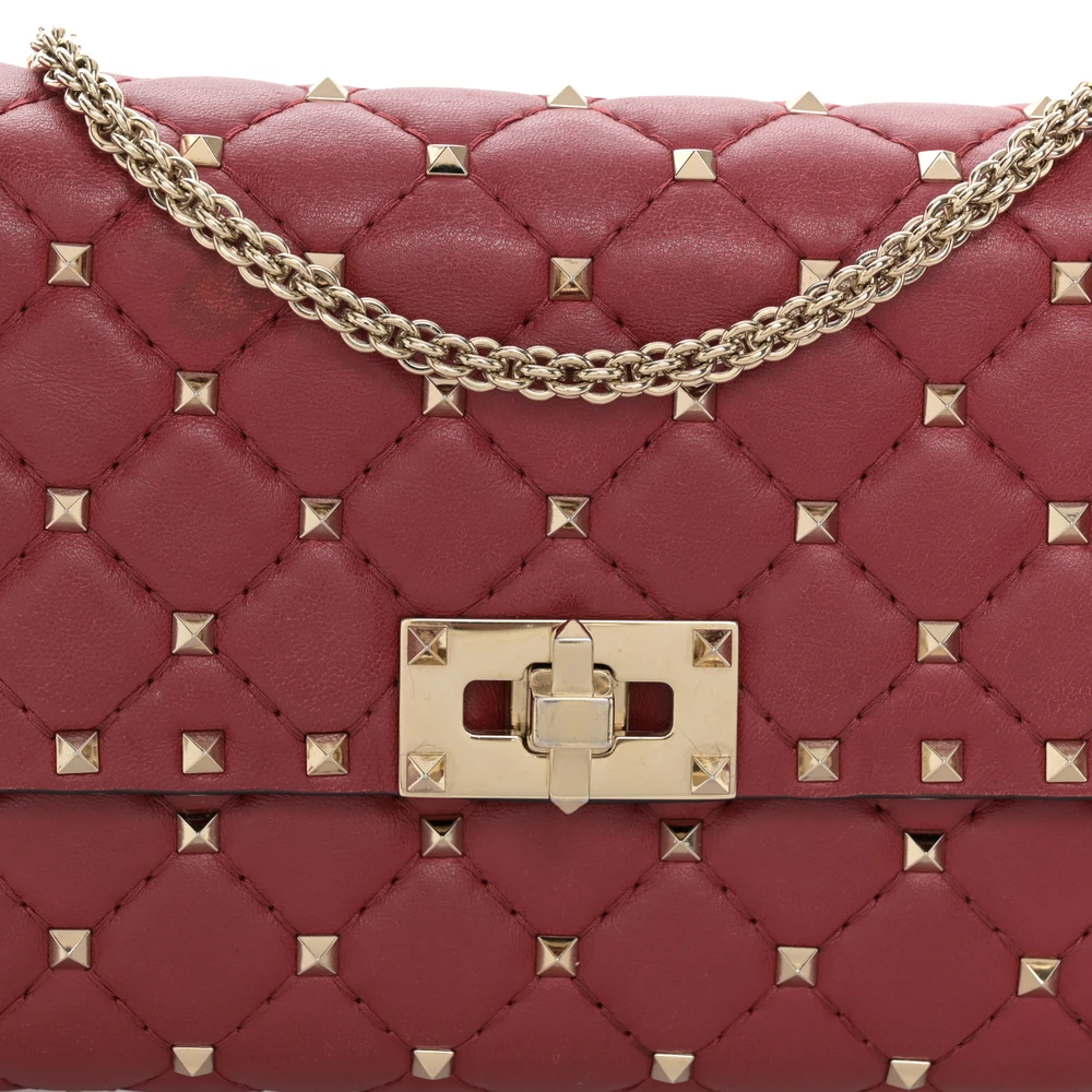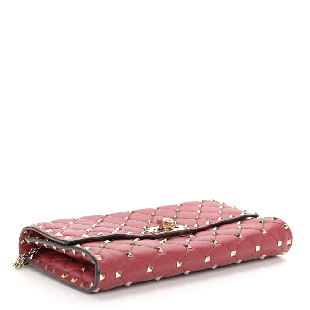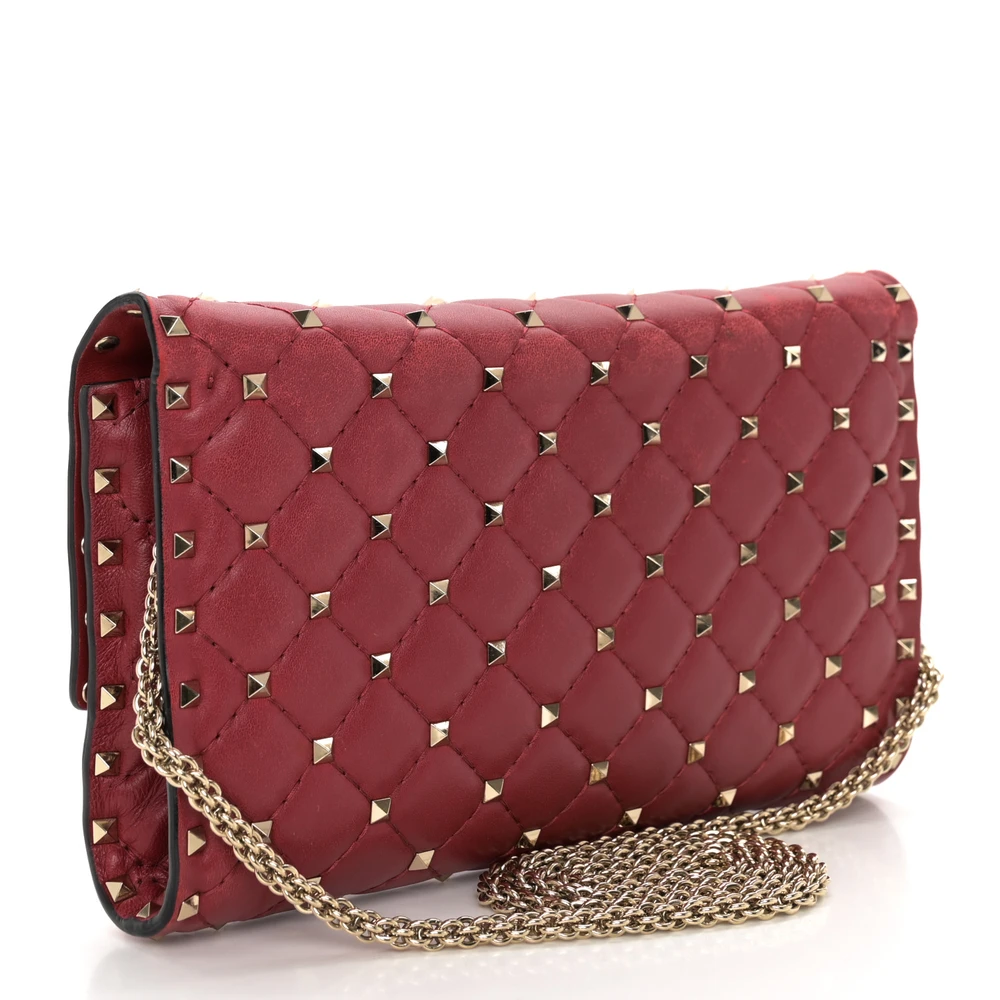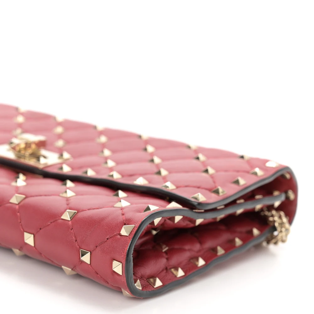 This Valentino Garavani Small Rockstud Spike Wallet on Chain in Rubino is elegant and compact. Crafted from nappa leather with light gold hardware. Features Rockstud detailing for a bold touch. Perfect for evening events or casual outings. Lightweight yet functional for essentials. A chic and timeless wallet.