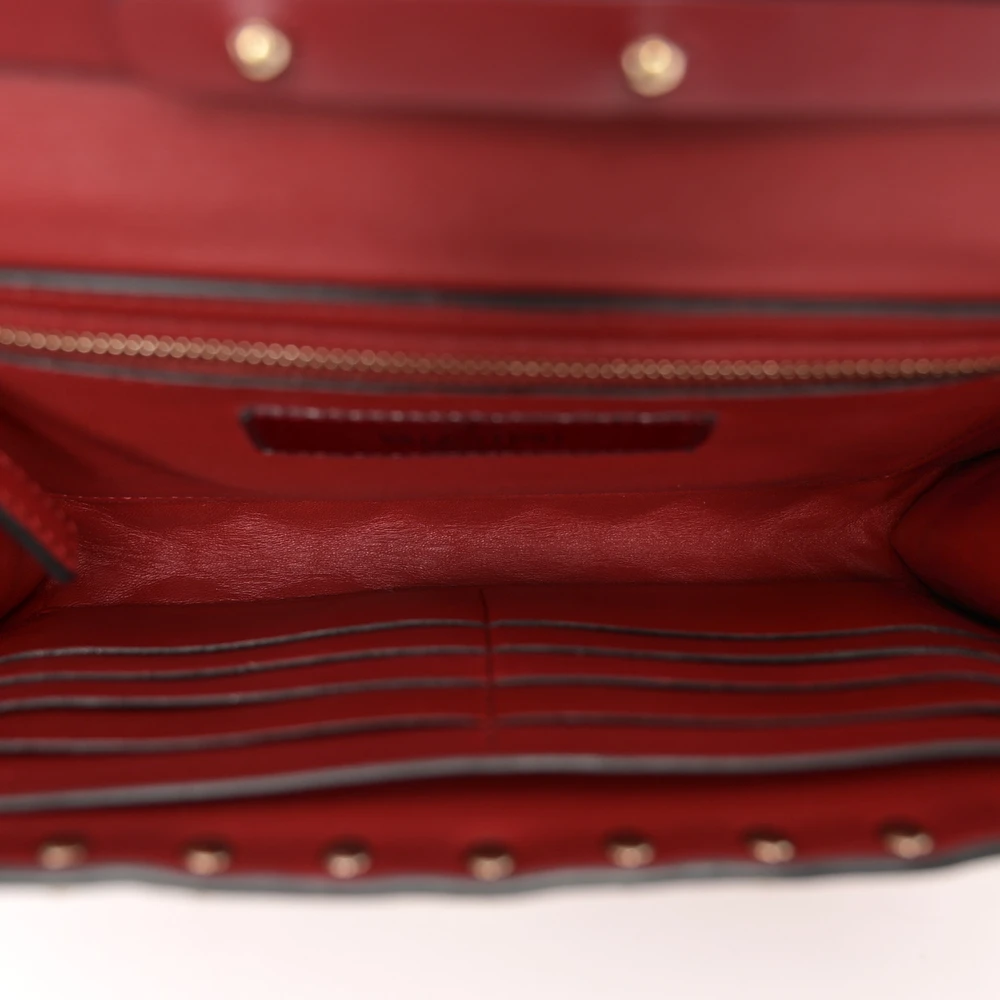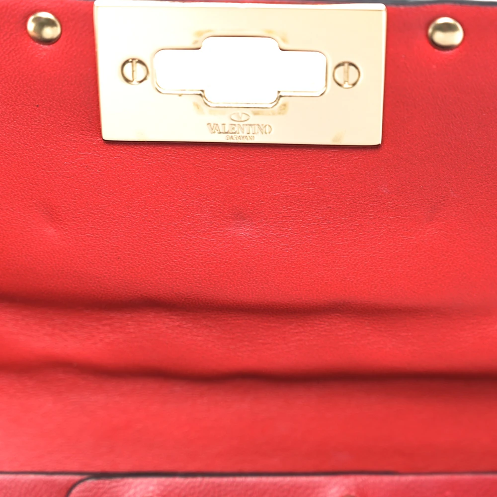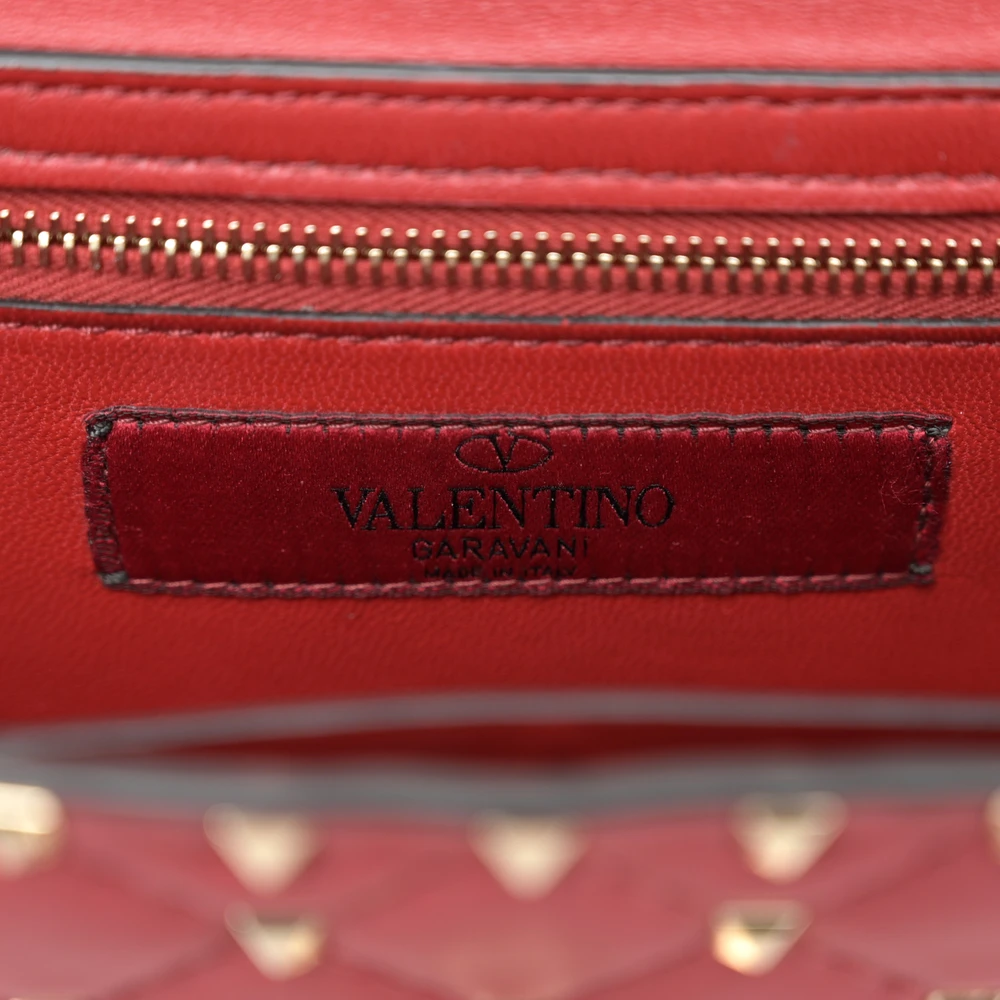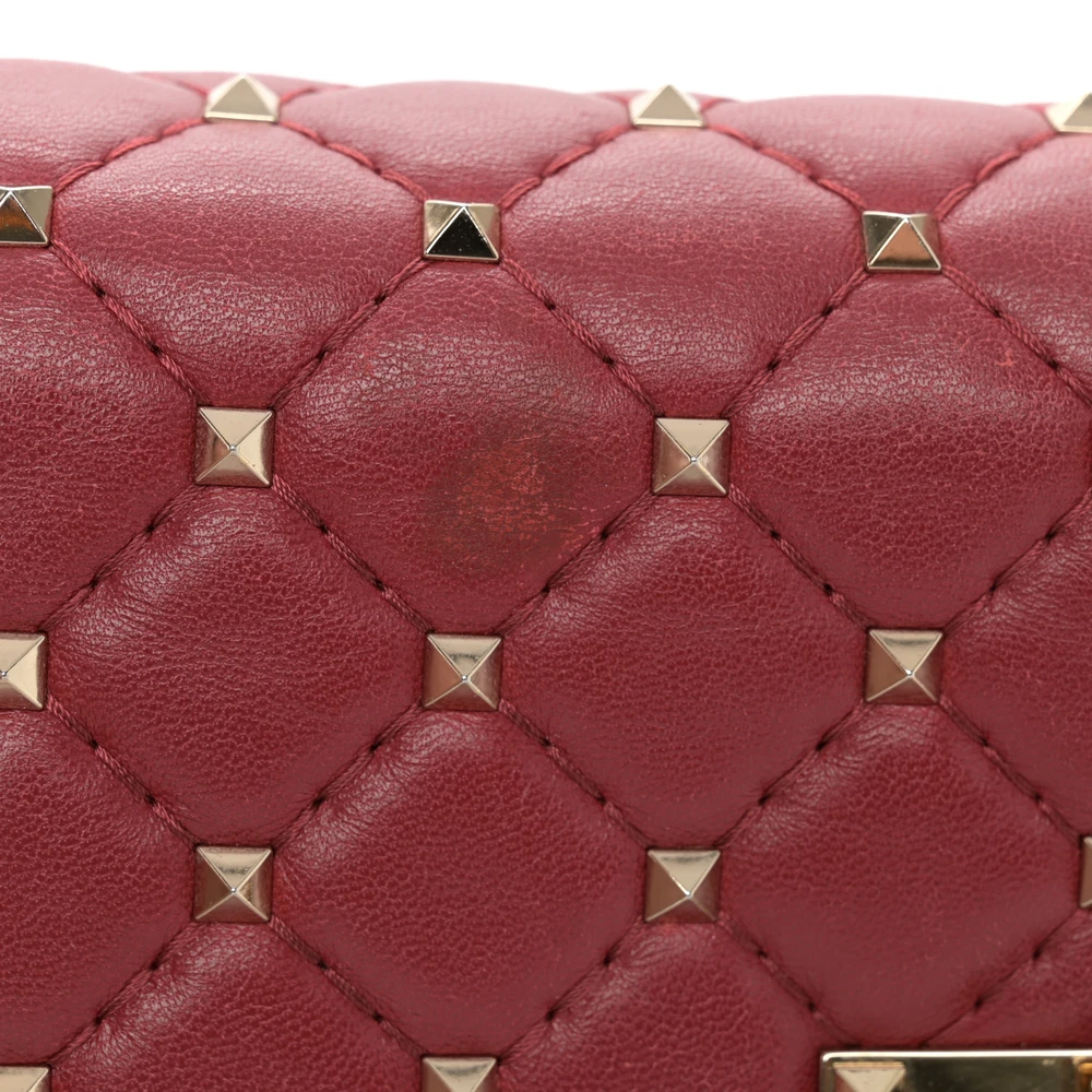 This Valentino Garavani Small Rockstud Spike Wallet on Chain in Rubino is elegant and compact. Crafted from nappa leather with light gold hardware. Features Rockstud detailing for a bold touch. Perfect for evening events or casual outings. Lightweight yet functional for essentials. A chic and timeless wallet.