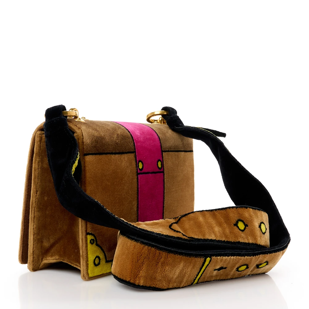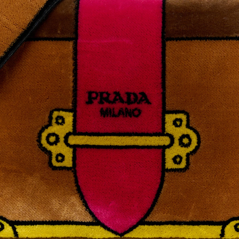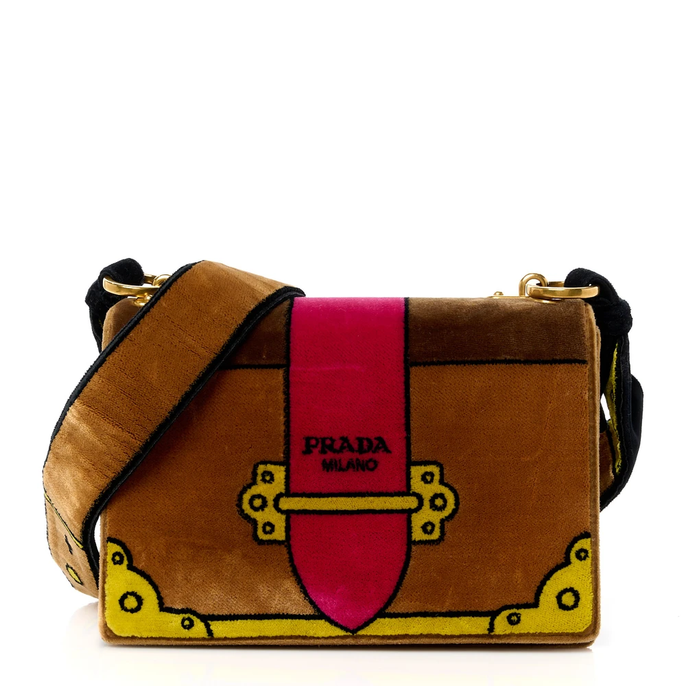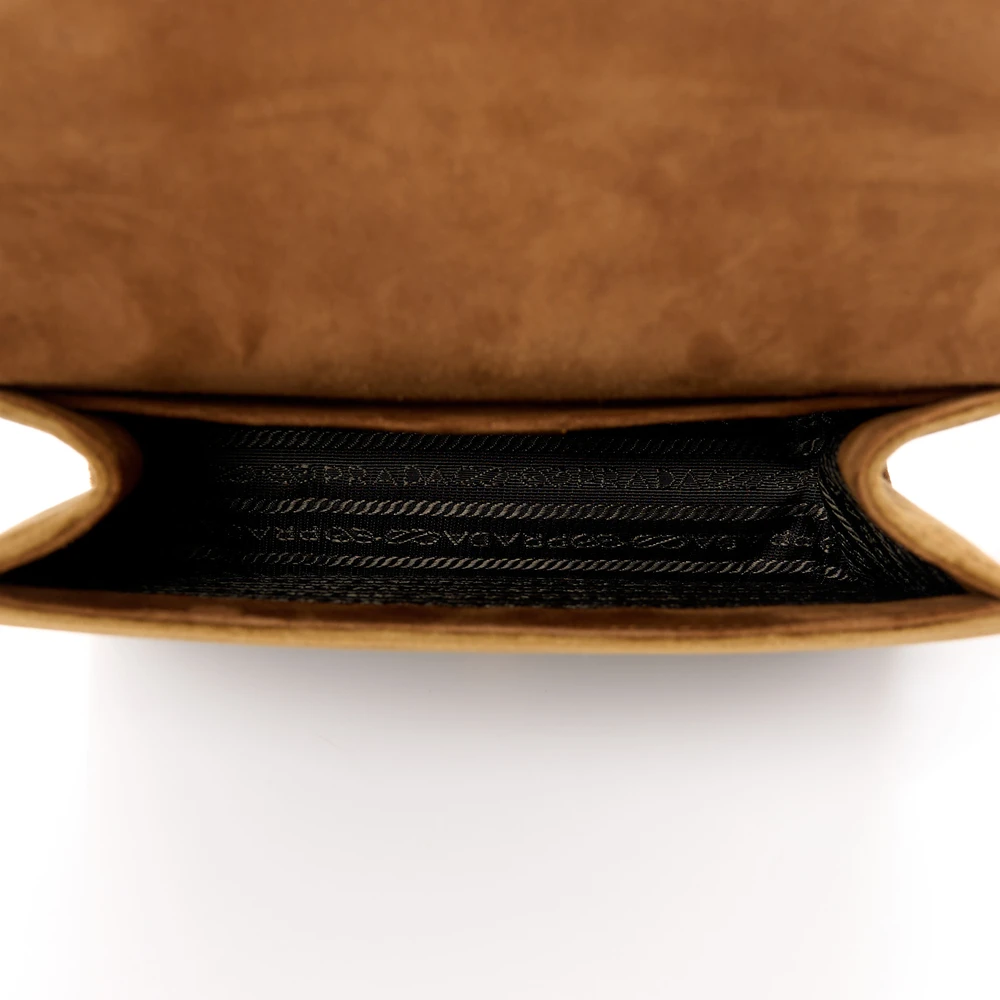This Prada Small Cahier Shoulder Bag in Cammello is crafted from Velluto Ricamo. The unique design adds a vintage charm. Compact yet spacious, it’s perfect for essentials. Adjustable strap ensures versatile styling. A statement piece for any outfit. A blend of elegance and practicality.