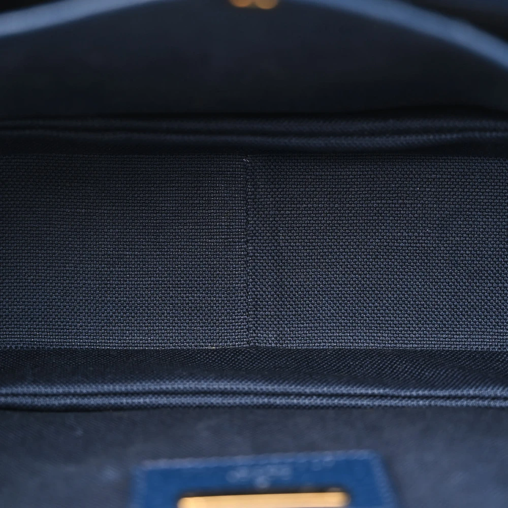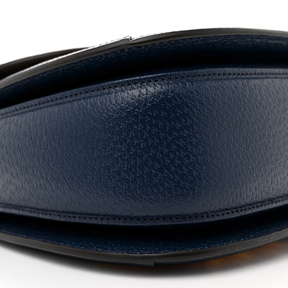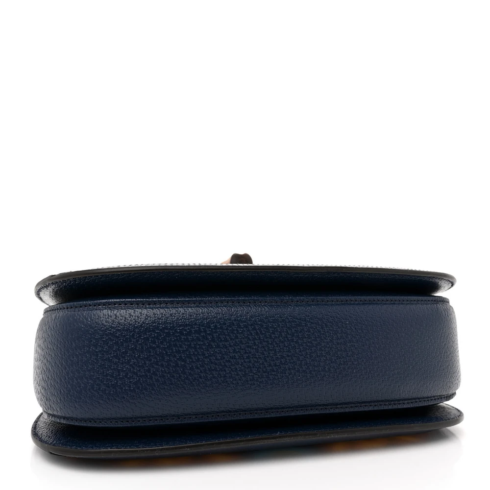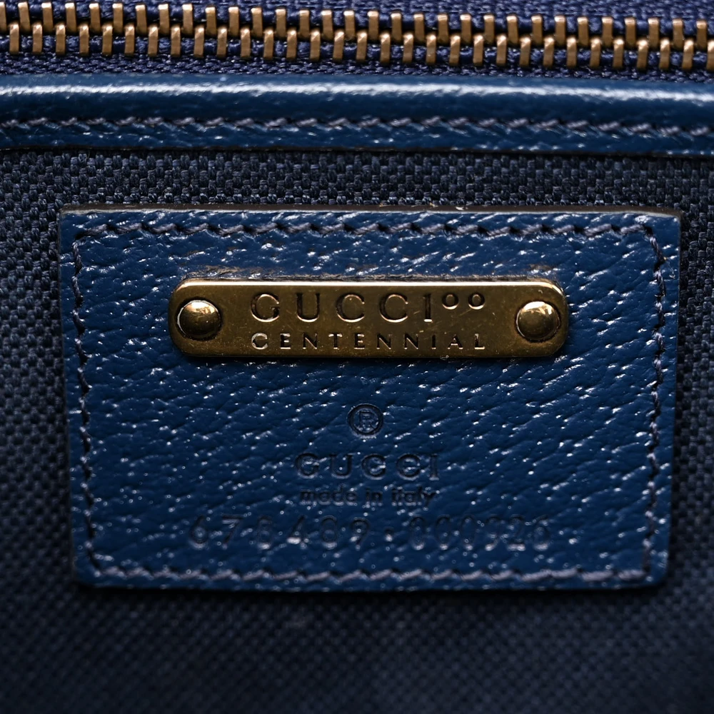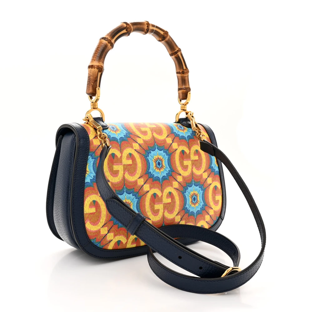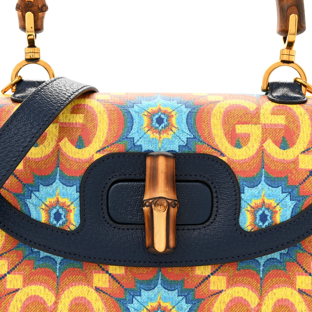 This Gucci Medium Kaleidoscope Bamboo 1947 Top Handle Bag features blue and orange multicolor calfskin leather. Brass hardware and bamboo handle add a signature touch. Spacious interior for versatile use. Bold kaleidoscope pattern makes it a standout accessory. A luxurious design with historical roots.